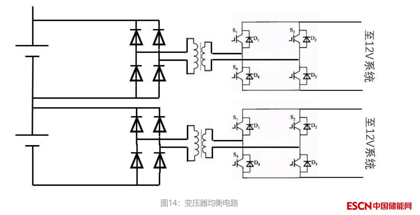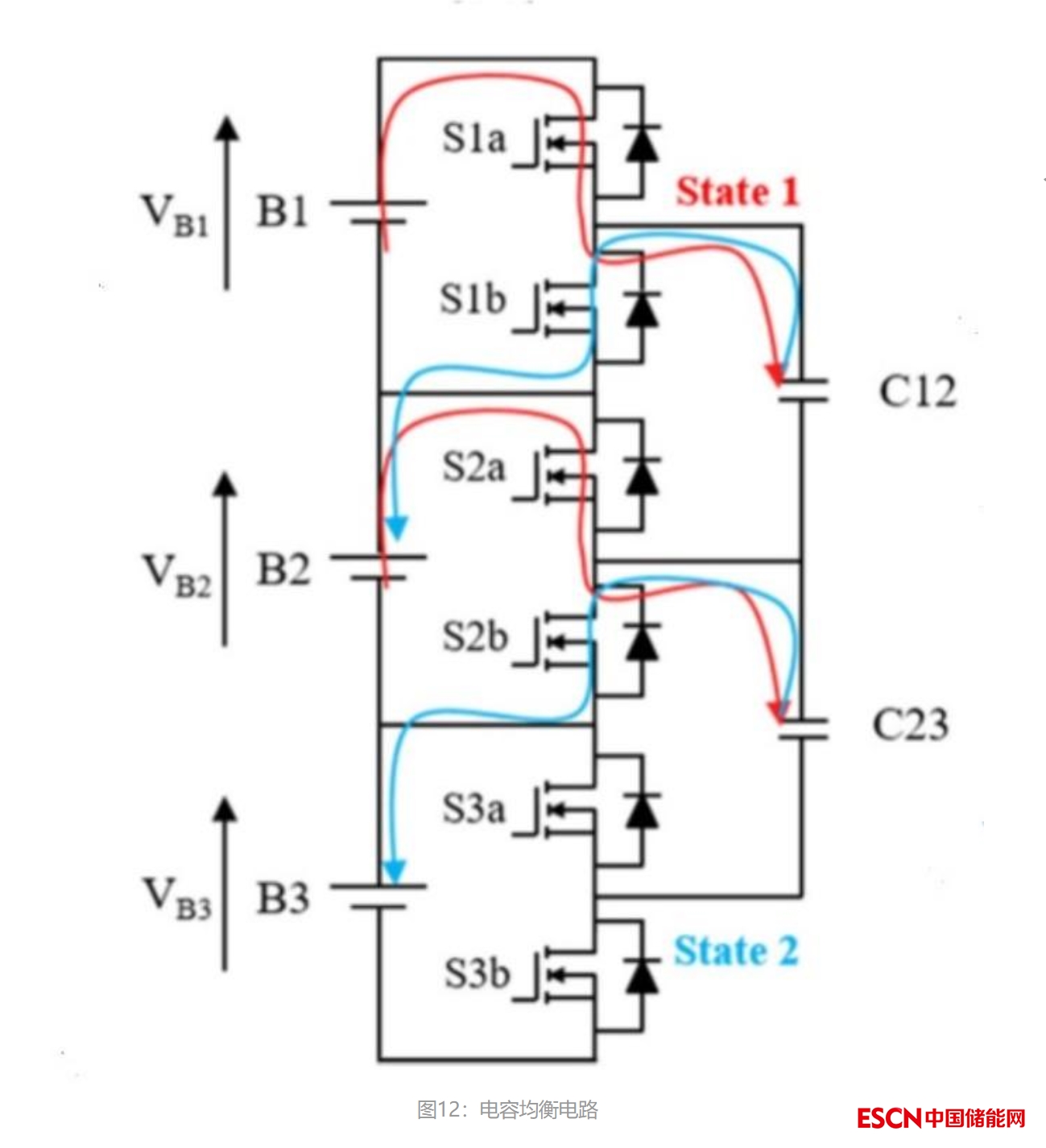 圖12所示電容均衡電路,在S1a閉合的情況下,電芯1給C12電容進(jìn)行充電,然后關(guān)閉S1a,閉合S1b,C12給電芯2進(jìn)行充電。因此通過電容的中介來對(duì)電芯中不平衡的電量進(jìn)行轉(zhuǎn)移。這樣的均衡電路只能從電壓高的電芯轉(zhuǎn)移到電量低的電芯。但在實(shí)際過程中,我們希望依據(jù)SOC值來進(jìn)行均衡,即有的電芯由于他容量比較少,所以電壓變化很快,在一個(gè)時(shí)刻它的電壓高,但在下個(gè)時(shí)刻它的電壓就會(huì)下降的很快,在這樣的情況下,我們不希望進(jìn)行電量的轉(zhuǎn)移。此外,開關(guān)順序的錯(cuò)誤會(huì)導(dǎo)致安全問題。