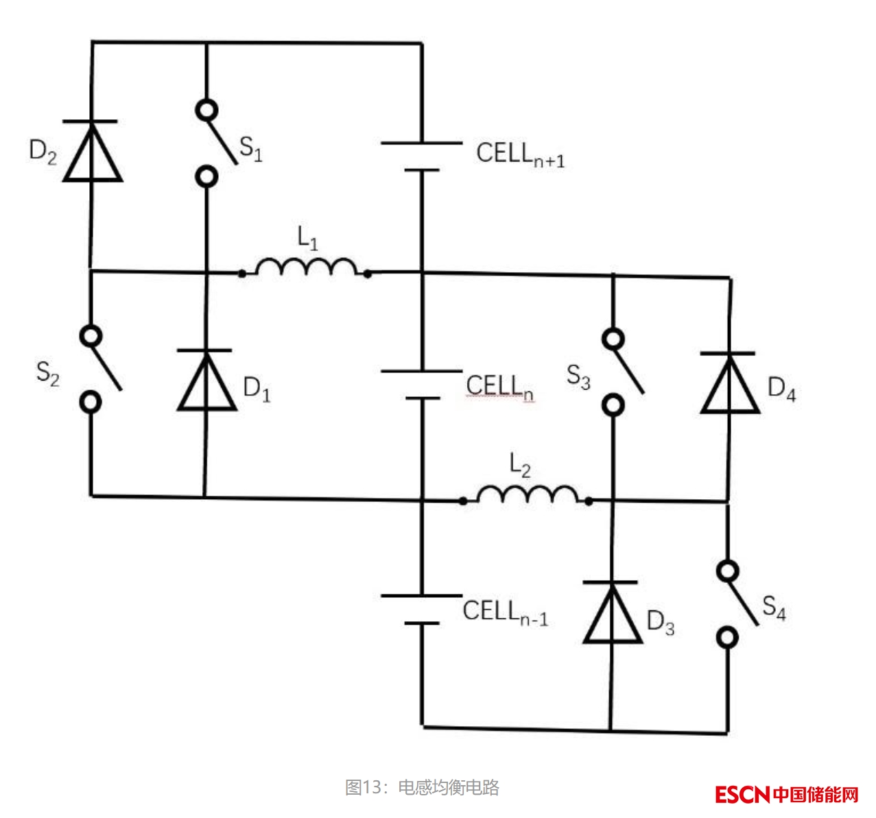 在均衡過程中,電荷可以從n+1電芯傳遞到n電芯。閉合S1,則電芯給電感L1進(jìn)行充電,將電量存儲(chǔ)在電感中,然后打開S1,電流經(jīng)過二極管D1給電芯n進(jìn)行充電。如果要實(shí)現(xiàn)電芯n到電芯n+1的電荷轉(zhuǎn)移,則控制開關(guān)S2。該方法不要求電池單元n+1的電壓高于電池單元n,也不受電壓差的限制。該方法需要選擇合適的電感大小、開關(guān)頻率來實(shí)現(xiàn)所需要的平衡電流,而不應(yīng)該使電感過于飽和。這個(gè)電路最大的缺點(diǎn)就是電路只能將能量從一個(gè)電池轉(zhuǎn)移到另一個(gè)電池,如果能量在大量的電池之間傳遞,那么這種傳遞效率將會(huì)顯著降低。