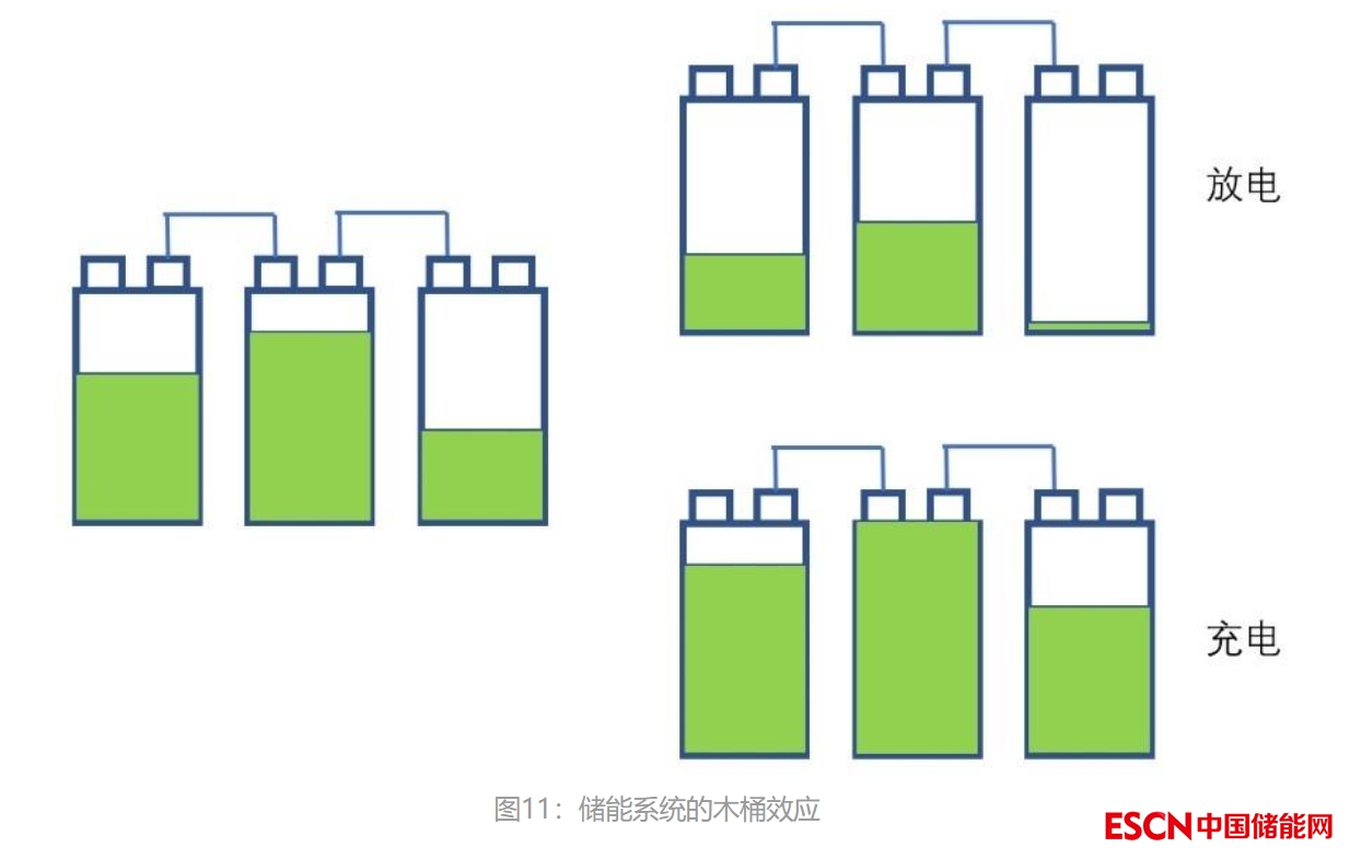 如圖11所示,當(dāng)電芯的SOH一致(容量一樣),SOC不一致(剩余電量不一樣)的情況下,在充電的過程中,中間那顆電芯充滿后,同一簇串聯(lián)的電芯就算沒有充滿也無法繼續(xù)進(jìn)行充電。在放電的過程中,最右邊的電芯放空后,其余同一簇的電芯也無法繼續(xù)放電。這就是儲(chǔ)能系統(tǒng)中由于串并聯(lián)連接后導(dǎo)致的木桶效應(yīng)。儲(chǔ)能系統(tǒng)集成其中一個(gè)核心的目標(biāo)就是要降低這種木桶效應(yīng)帶來的影響,使得系統(tǒng)的循環(huán)壽命逼近單體電芯的循環(huán)壽命。