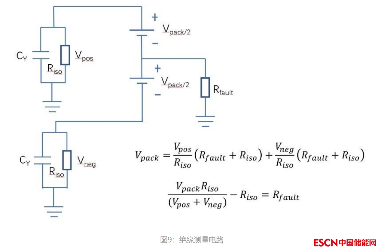 通過兩次測(cè)量可以計(jì)算出Rfault的值。對(duì)于每次測(cè)量,將已知電阻Riso接入到接地與電池的正極和負(fù)級(jí)之間,并測(cè)量電阻上的電壓。當(dāng)測(cè)量電阻Riso接入時(shí),它和Y型電容形成了一個(gè)RC電路。電容器必須充滿之后才能進(jìn)行測(cè)量。這就決定了進(jìn)行這種測(cè)量所需要的最小時(shí)間。