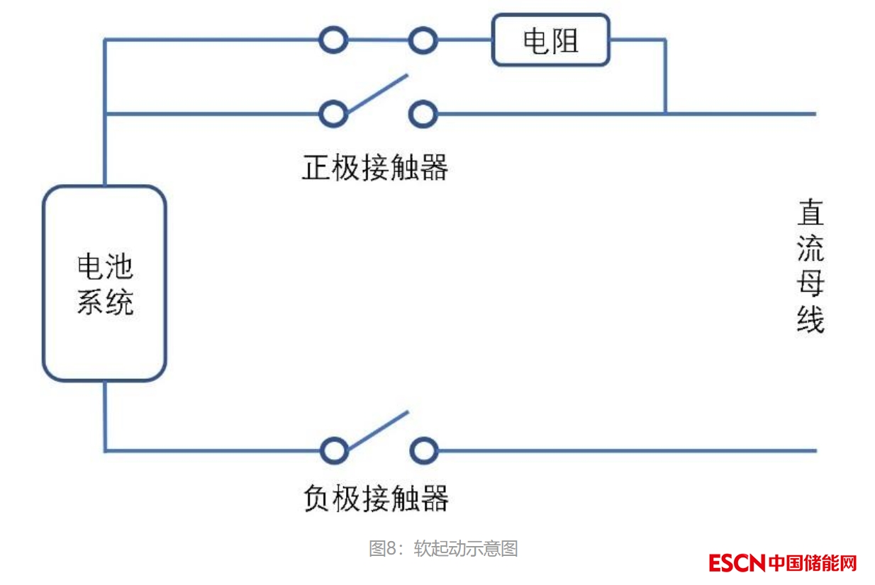 在多支路的儲(chǔ)能系統(tǒng)中,BCMU中需要具有軟起動(dòng)功能或者預(yù)充電功能的電路,以緩解不同簇之間由于壓差過大并聯(lián)在同一個(gè)母線上導(dǎo)致的大環(huán)流。這種環(huán)流會(huì)對(duì)接觸器造成較大的傷害。一般情況下,接觸器應(yīng)該在較小的壓差下閉合,直到觸點(diǎn)完全閉合后才應(yīng)流過電流。解決此類問題的最常用的方法就是使用軟起動(dòng)電路(見圖8)。該電路利用一個(gè)電阻和附加接觸器進(jìn)行串聯(lián),然后再并聯(lián)到一個(gè)主接觸器上。
