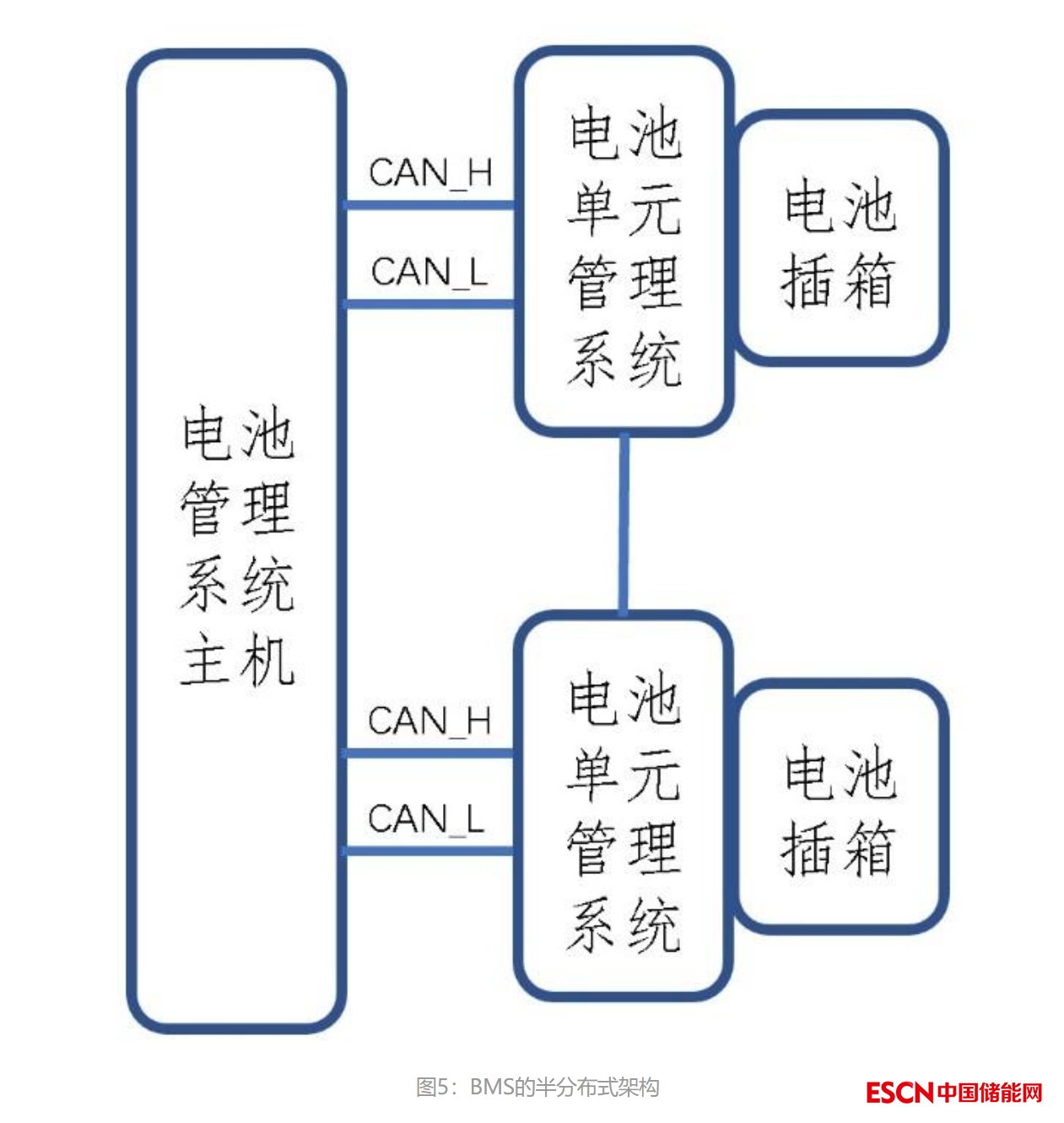 大規(guī)模電化學(xué)儲(chǔ)能BMS的硬件架構(gòu)可分為兩類,第一類為分布式架構(gòu),另一類為半分布式架構(gòu)(見圖5)。分布式體系架構(gòu)已經(jīng)在上一小節(jié)中進(jìn)行了闡述。它的主要特點(diǎn)是高度的模塊化,在今后具有高度集成的系統(tǒng)可能會(huì)將檢測(cè)充電電路直接合并到電池模塊中。對(duì)于半分布式架構(gòu),其中的電池管理單元對(duì)一個(gè)電池插箱負(fù)責(zé),它可以與高壓測(cè)量和控制設(shè)備一起操作。該模塊可包含高壓測(cè)量,接觸器或繼電器、熔絲和電流傳感器或分流器。這樣的模塊使得系統(tǒng)更容易進(jìn)行縮放。