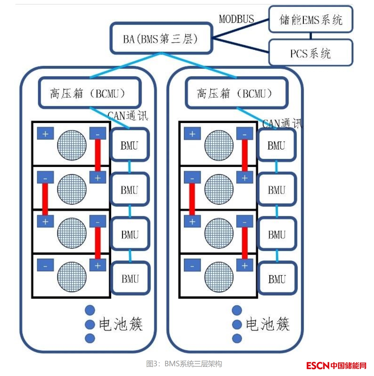 根據(jù)電池系統(tǒng)的整體架構(gòu),BMS的系統(tǒng)架構(gòu)也是相對(duì)應(yīng)的(見圖3)。一般來說,大規(guī)模電化學(xué)儲(chǔ)能BMS系統(tǒng)分為三層架構(gòu)。最底層架構(gòu)為BMU,即每一個(gè)電池插箱都會(huì)配置一個(gè)BMU系統(tǒng),BMU系統(tǒng)通過電壓和溫度采集線采集插箱內(nèi)每顆電芯的電壓和溫度,同時(shí)BMU系統(tǒng)接收簇管理單元(BCMU)系統(tǒng)下發(fā)的指令,控制插箱內(nèi)風(fēng)扇的啟停。此外,BMU裝置還會(huì)通過均衡線束對(duì)插箱內(nèi)的電芯進(jìn)行主動(dòng)均衡,此類均衡電流一般為3A-5A。