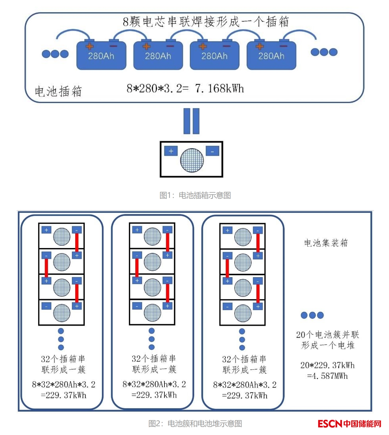電化學(xué)儲(chǔ)能的最小單元為電芯,以磷酸鐵鋰電芯為例,其電壓為3.2V,現(xiàn)主流儲(chǔ)能電芯的容量為120Ah-280Ah。對(duì)于大規(guī)模電化學(xué)儲(chǔ)能系統(tǒng)來說,整個(gè)架構(gòu)可以分為3個(gè)部分,第一個(gè)部分為電池插箱部分,即把電芯進(jìn)行串聯(lián)放入到一個(gè)殼體當(dāng)中,這個(gè)殼體我們稱為電池插箱(見圖1),電池插箱內(nèi)的電芯通過鋁排進(jìn)行串聯(lián)焊接。電池管理系統(tǒng)的最底層控制單位(BMU)就是用來監(jiān)測(cè)插箱內(nèi)的每顆電芯。第二部分為電池簇部分,即把多個(gè)電池插箱進(jìn)行串聯(lián)形成一個(gè)電池簇。電池簇的電壓要達(dá)到變流器(PCS)所需要的電壓。目前,主流的電力變流器分為1000V和1500V直流系統(tǒng)。對(duì)于1000V系統(tǒng),需要將256顆280Ah的電芯進(jìn)行串聯(lián)形成一簇電池,即需要256/8=32個(gè)插箱進(jìn)行串聯(lián)。插箱之間的串聯(lián)可以使用銅排連接,這樣的串聯(lián)方式下一簇電池的容量為256*280Ah*3.2 = 229.37kWh。這一層對(duì)應(yīng)于電池管理單元的第二層控制單元(BCMU)即為電池簇管理單元。第三部分為電池堆管理部分,即把多個(gè)電池簇并聯(lián)在一起形成一個(gè)大的儲(chǔ)能電堆。例如把20簇電池并聯(lián)在一起,放入到一個(gè)集裝箱內(nèi),則這個(gè)集裝箱的電池容量為229.37kWh*20 =4.587MWh。對(duì)于一個(gè)100MWh的電化學(xué)儲(chǔ)能系統(tǒng),需要22個(gè)集裝箱。電堆是由電池管理系統(tǒng)的第三層控制單元(BA)進(jìn)行控制。圖2展示了電池簇和電池堆示意圖。