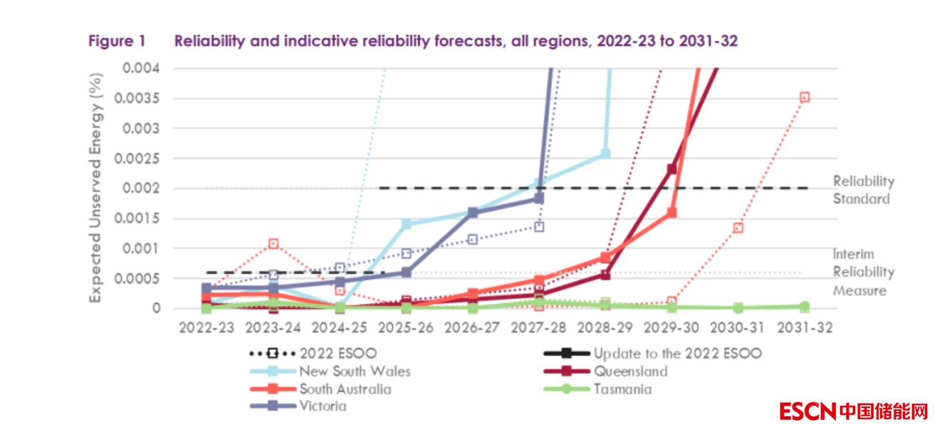 他提到,自發(fā)布2022年ESOO以來,南澳大利亞州(2023-24年)和維多利亞州(2024-25年)的短期預(yù)測可靠性差距已經(jīng)被新的天然氣發(fā)電、風(fēng)電和電池儲能的發(fā)展所填補(bǔ),同時現(xiàn)有燃?xì)獍l(fā)電機(jī)的退役也被推遲。因此,在此次更新的可靠性預(yù)測中不需要新的零售商可靠性義務(wù)(RRO)可靠性工具。從2025年起,與臨時可靠性措施相比,可靠性差距開始出現(xiàn)。預(yù)計從2027年起,各大陸地區(qū)的預(yù)期使用率將超過可靠性標(biāo)準(zhǔn),到2031-2032年時,的所有大陸地區(qū)都將違反可靠性標(biāo)準(zhǔn),至少有5座燃煤電廠預(yù)計將退役,占NEM總?cè)萘康募s13%。因此,迫切需要對可再生能源、長時儲能和傳輸進(jìn)行緊急和持續(xù)的投資,以可靠地滿足澳大利亞家庭和企業(yè)的需求。具體如下圖所示: