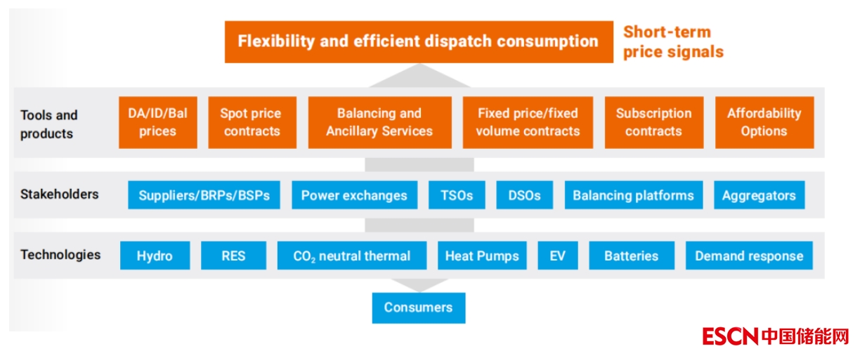 為了增加能源系統(tǒng)的短期靈活性,日前、日內(nèi)和平衡價格信號對于確保發(fā)電和能源消耗的高效調(diào)度、優(yōu)化綜合能源系統(tǒng)至關(guān)重要。為了滿足未來靈活性資源組合的需求,短期市場將需要逐步更接近實時地運行,采用更短的結(jié)算期,消除對市場進入和價值堆疊的障礙。