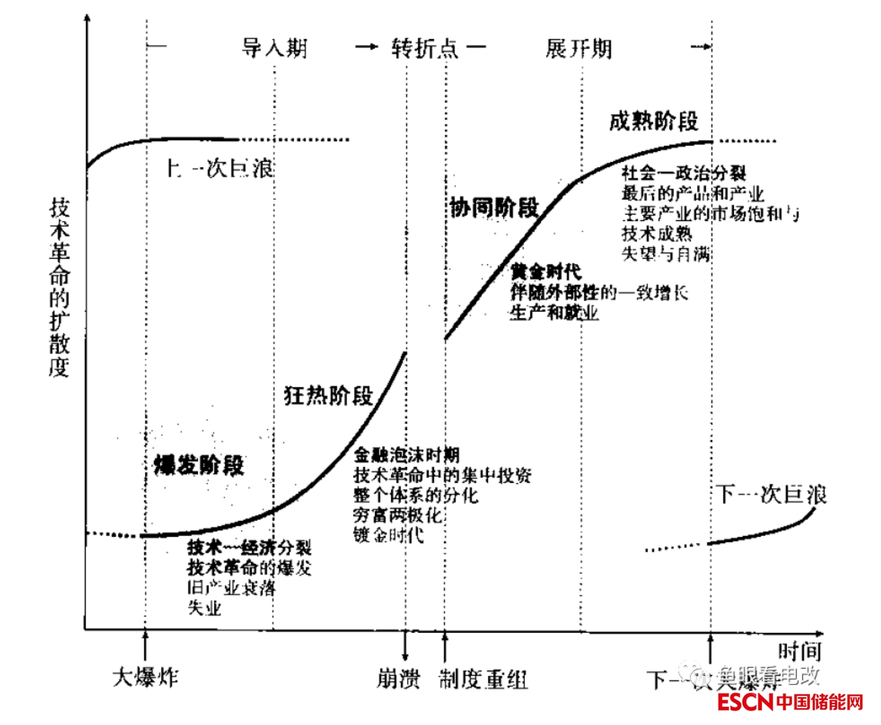 《技術(shù)革命與金融資本》中,對新技術(shù)的應(yīng)用分為兩個周期:導(dǎo)入期(包括爆發(fā)階段和狂熱階段)和展開期(包括協(xié)同階段和成熟階段)。