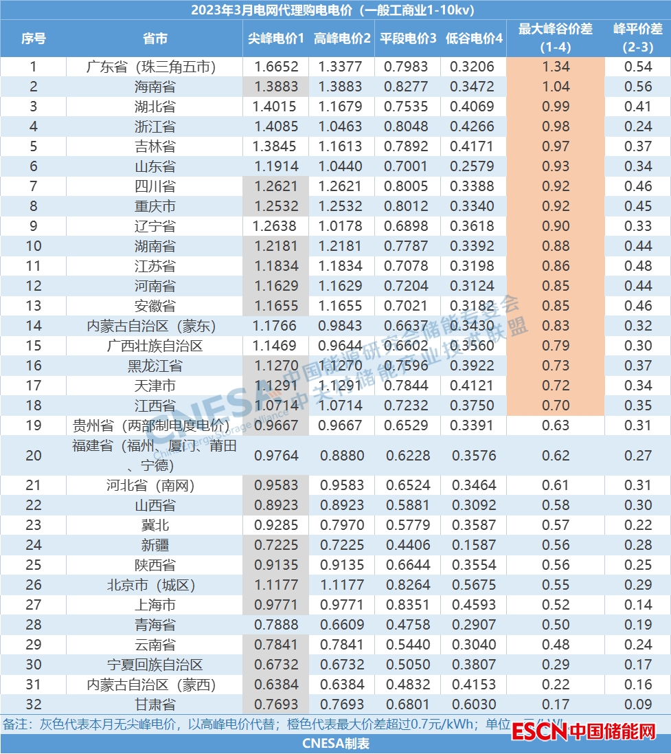目前,大部分地區(qū)已公布2023年3月電網(wǎng)代購(gòu)電價(jià),CNESA對(duì)各地一般工商業(yè)10KV的單一制電價(jià)進(jìn)行了匯總測(cè)算?,F(xiàn)有18個(gè)地區(qū)的最大峰谷價(jià)差超過(guò)0.7元/kWh,其中廣東省(珠三角五市)和海南省的最大峰谷價(jià)差超過(guò)1元/kWh,價(jià)差變化較大的地區(qū)有海南省從2月的0.93元/kWh提高到1.04元/kWh;湖南省從1元/kWh降至0.88元/kWh;河北省南網(wǎng)從0.76元/kWh降至0.61元/kWh,其中,河北省南網(wǎng)3月不執(zhí)行尖峰電價(jià)。另外,甘肅省一直處于價(jià)差低位,本月0.17元/kWh創(chuàng)造電網(wǎng)代購(gòu)電以來(lái)的最低價(jià)差,甘肅作為外送電大省,省內(nèi)電力電量平衡相對(duì)有保障,用電負(fù)荷較平穩(wěn)。