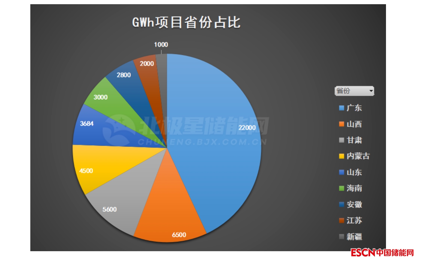 從地區(qū)來(lái)看,廣東省GWh級(jí)儲(chǔ)能項(xiàng)目數(shù)量最多,建設(shè)規(guī)模最大,共有廣東惠州500MW/1000MWh獨(dú)立儲(chǔ)能電站項(xiàng)目、廣東云浮新區(qū)500MW/1000MWh獨(dú)立儲(chǔ)能電站項(xiàng)目等12個(gè)儲(chǔ)能項(xiàng)目簽約、備案等,總規(guī)模達(dá)到11GW/22GWh。其次是山西省,中核榆次500MW/1000MWh共享儲(chǔ)能項(xiàng)目、山西忻州500MW/1000MWh共享儲(chǔ)能電站等6個(gè)儲(chǔ)能項(xiàng)目簽約、備案,項(xiàng)目建設(shè)規(guī)模6.5GWh。
