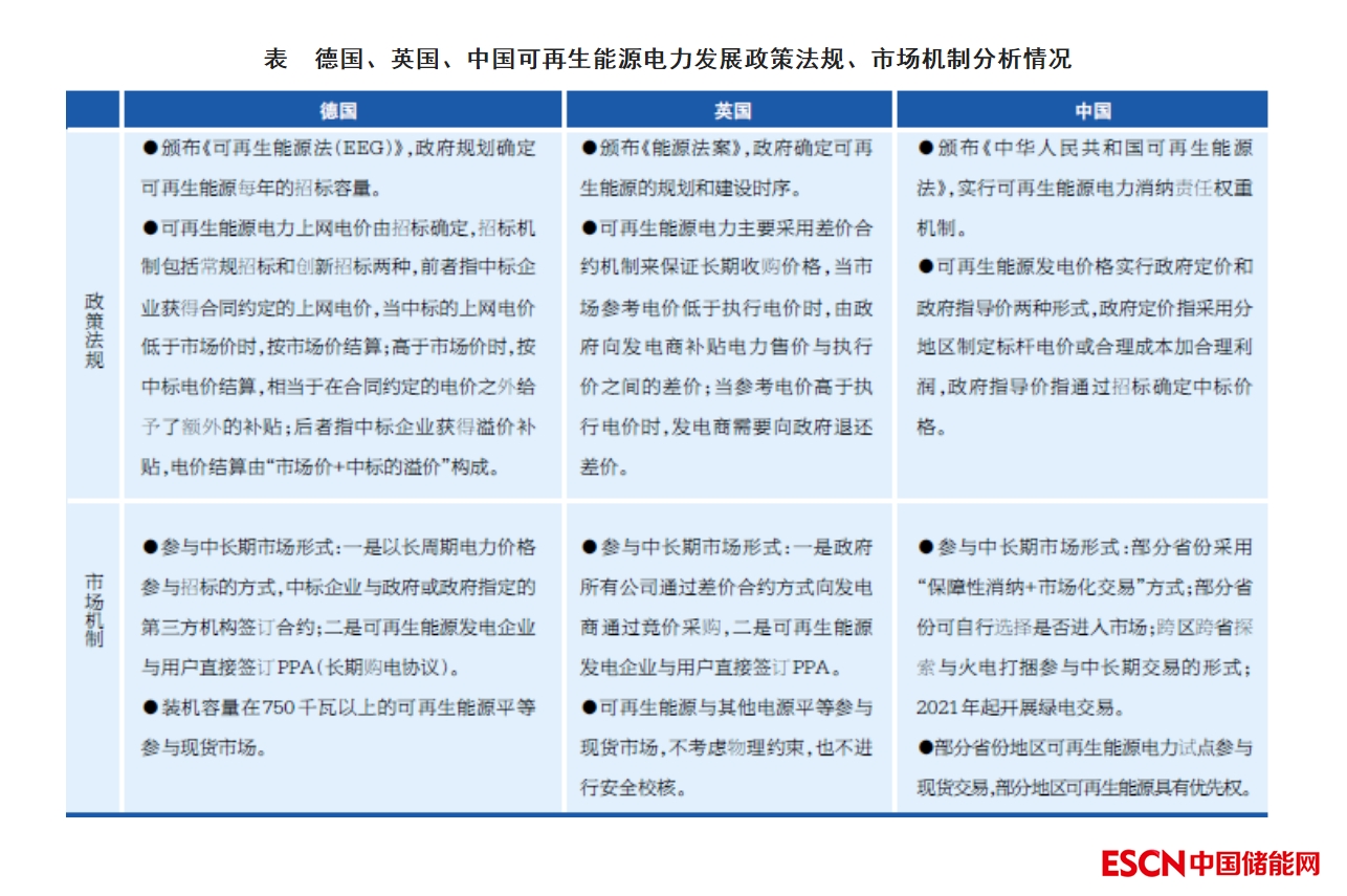 國(guó)外通常是在國(guó)家層面先推出相關(guān)的法律法規(guī)來(lái)激勵(lì)和促進(jìn)可再生能源的發(fā)展,并提出比較具體的發(fā)展目標(biāo)作為要求。同時(shí)建立了相對(duì)成熟的電力市場(chǎng)機(jī)制和相應(yīng)的管理體制具體落實(shí)可再生能源參與電力市場(chǎng),可再生能源在政策和市場(chǎng)機(jī)制配套下具備良好的發(fā)展環(huán)境,可再生能源的發(fā)展取得了較為不錯(cuò)的成效,2021年德國(guó)和英國(guó)的風(fēng)、光裝機(jī)比例都已接近或超過(guò)整體裝機(jī)總量的一半,風(fēng)、光發(fā)電量占比也接近或超過(guò)整體發(fā)電量的1/4。