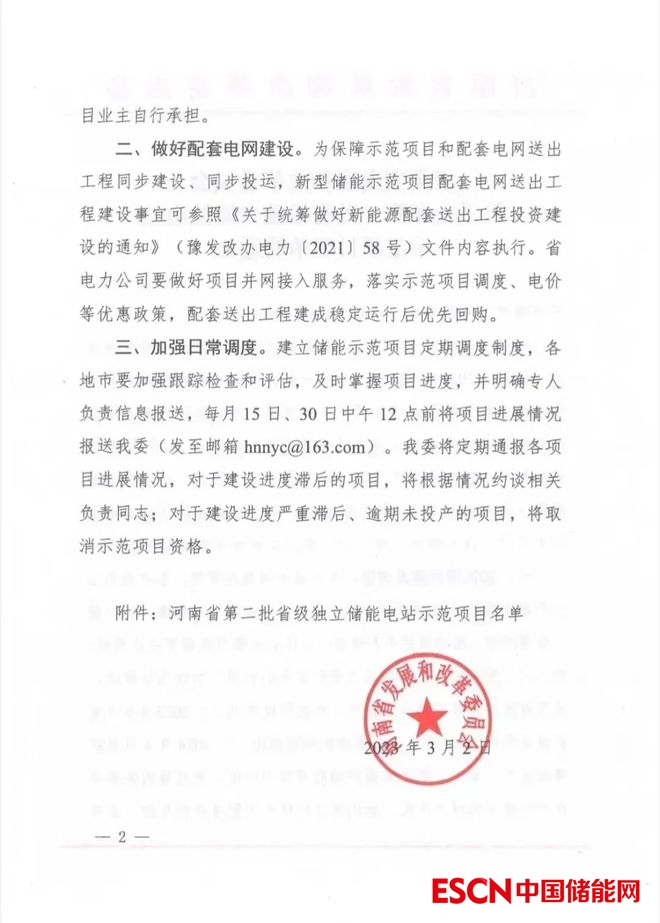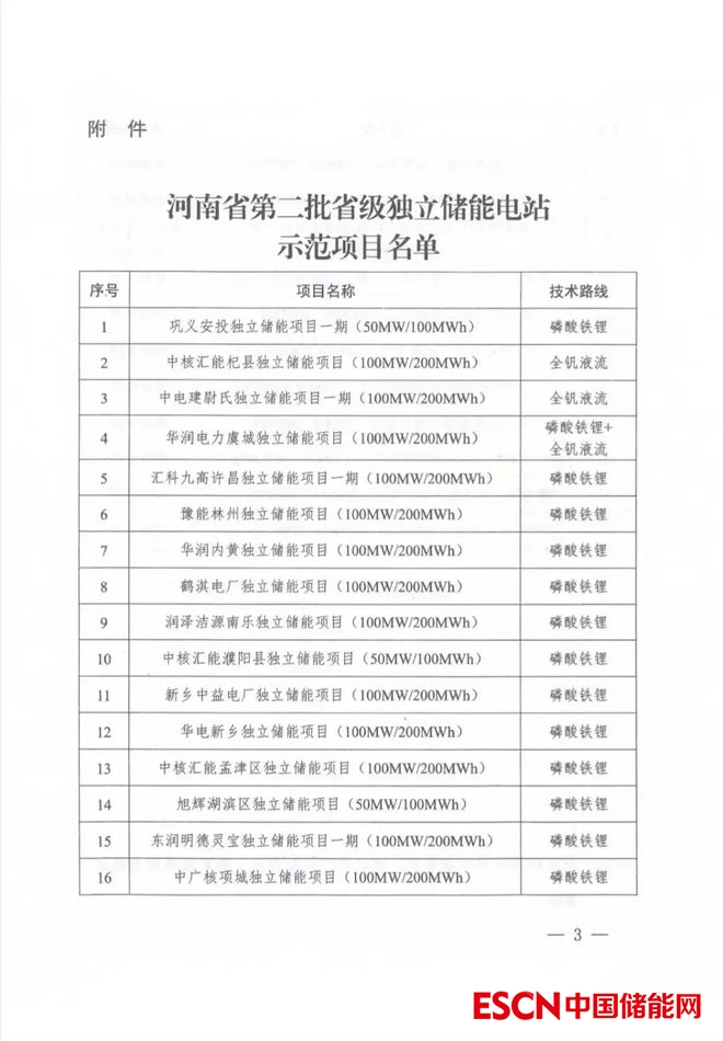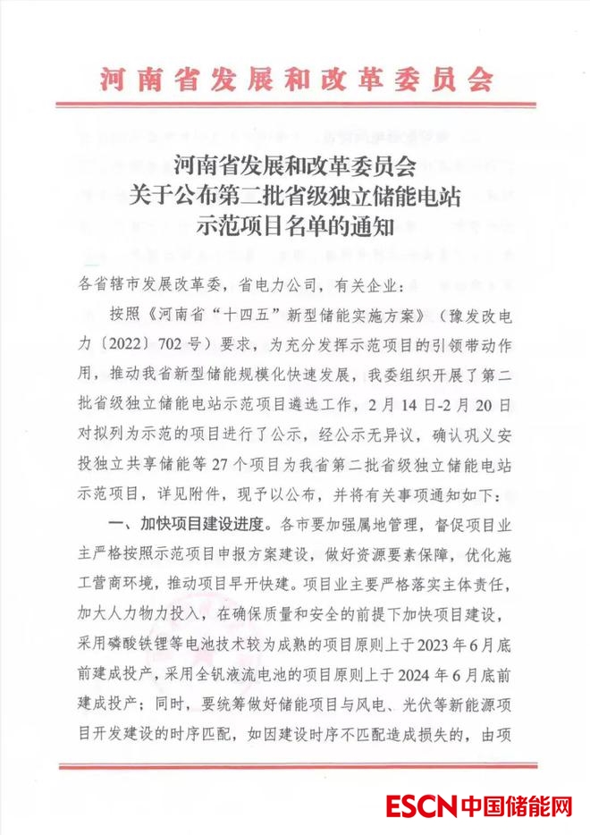 河南省發(fā)改委下發(fā)《關(guān)于公布第二批省級(jí)獨(dú)立儲(chǔ)能電站示范項(xiàng)目名單的通知》
