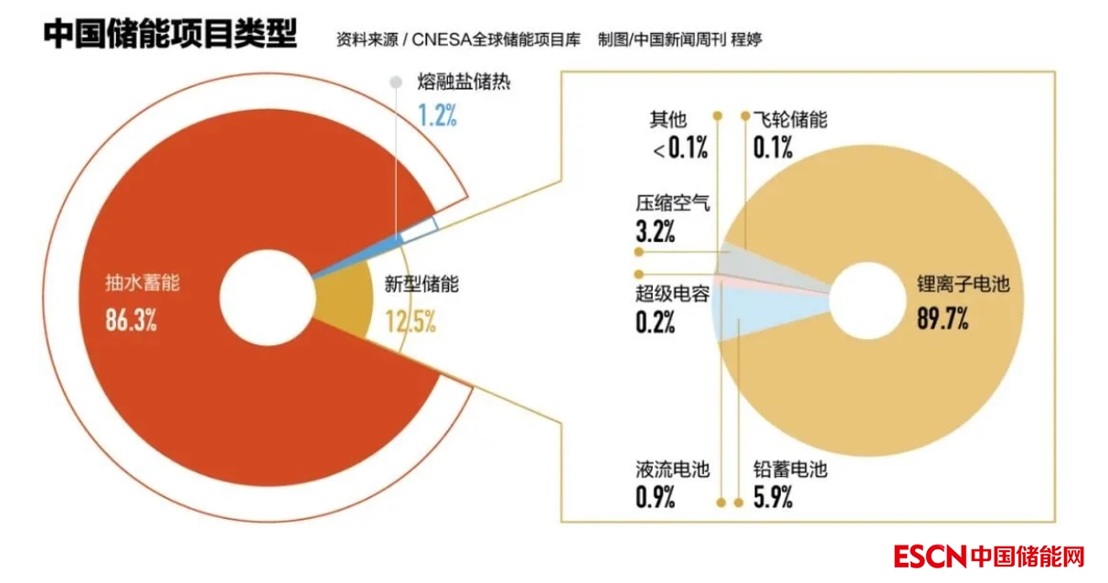 這也給新型儲能帶來機遇。所謂新型儲能指抽水蓄能以外的其他儲能技術(shù)路線,其中以鋰離子電池為代表的電化學(xué)儲能為主。截至2022年底,全國新型儲能裝機中,鋰離子電池儲能占比94.5%、壓縮空氣儲能占比2.0%、液流電池儲能占比1.6%、鉛酸(炭)電池儲能占比1.7%、其他技術(shù)路線占比0.2%。