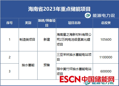 3月1日,海南省發(fā)委員會(huì)發(fā)布《海南省2023年重點(diǎn)(重大)項(xiàng)目投資計(jì)劃》,其中包含3個(gè)儲(chǔ)能項(xiàng)目。1個(gè)儲(chǔ)能產(chǎn)品制造類項(xiàng)目,海南星之海新材料有限公司的2萬(wàn)噸電池級(jí)氫氧化鋰項(xiàng)目,它將為當(dāng)?shù)氐男履茉雌嚒?chǔ)能電站等提供高品質(zhì)的儲(chǔ)能材料。2個(gè)預(yù)備抽水儲(chǔ)能項(xiàng)目為三亞羊林抽水蓄能電站項(xiàng)目和瓊中黃竹坪抽水蓄能電站項(xiàng)目。