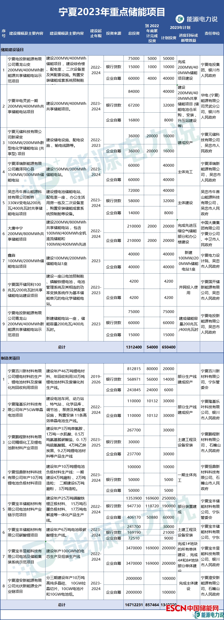 寧夏自治區(qū)發(fā)改委印發(fā)的《2023年自治區(qū)本級(jí)重點(diǎn)項(xiàng)目投資計(jì)劃》,該計(jì)劃包含17個(gè)儲(chǔ)能項(xiàng)目,其中有9個(gè)儲(chǔ)能建設(shè)項(xiàng)目,8個(gè)儲(chǔ)能產(chǎn)品制造類項(xiàng)目。