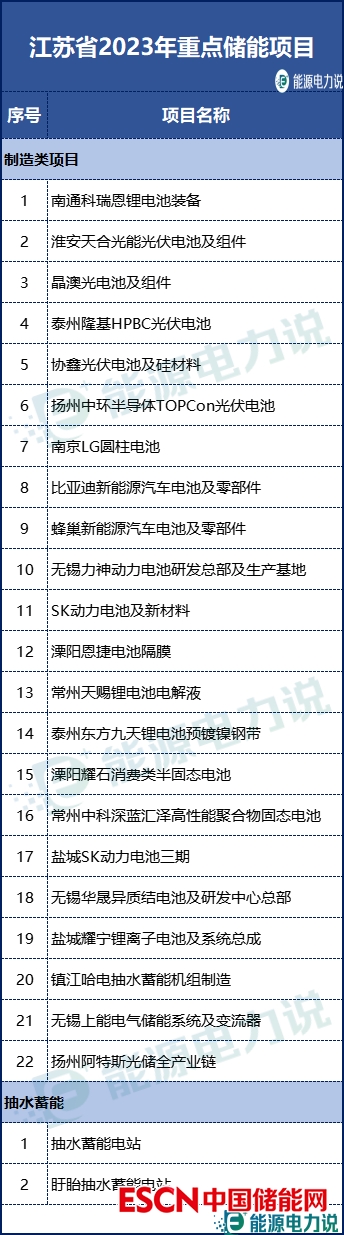 江蘇省2023年重點(diǎn)儲(chǔ)能項(xiàng)目共24個(gè)項(xiàng)目,包含22個(gè)儲(chǔ)能產(chǎn)品制造類項(xiàng)目和2個(gè)抽水蓄能項(xiàng)目。