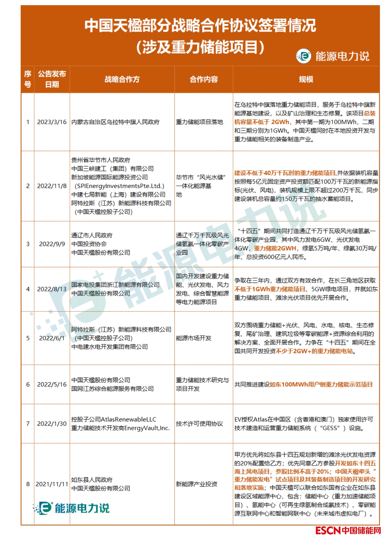 2022年以來,中國天楹與內(nèi)蒙烏拉特中旗人民政府、貴州畢節(jié)人民政府、內(nèi)蒙通遼市人民政府、中國投資協(xié)會、三峽建工、中建七局、國家電投、中電建、國網(wǎng)綜能等單位達成戰(zhàn)略合作,合作內(nèi)容均有涉及重力儲能。