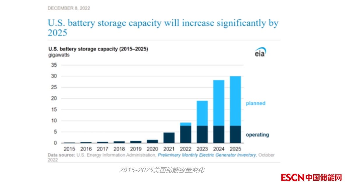 在 2020 年之前,美國的儲能容量可以忽略不計,這一年之后則迅速增加。截至 2022 年 10 月,全美已有7.8 GW 的大規(guī)模儲能設施開始運營,且預計到年底還將增加 1.4 GW 的儲能容量。EIA 預計 2023 年至 2025 年將增加 20.8 GW 的儲能容量。儲能容量的增長速度超過了太陽能裝機容量的早期增長速度。美國的太陽能容量從 2010 年開始擴張,從 2010 年的不到 1吉瓦增長到 2015 年的 13.7 吉瓦。
