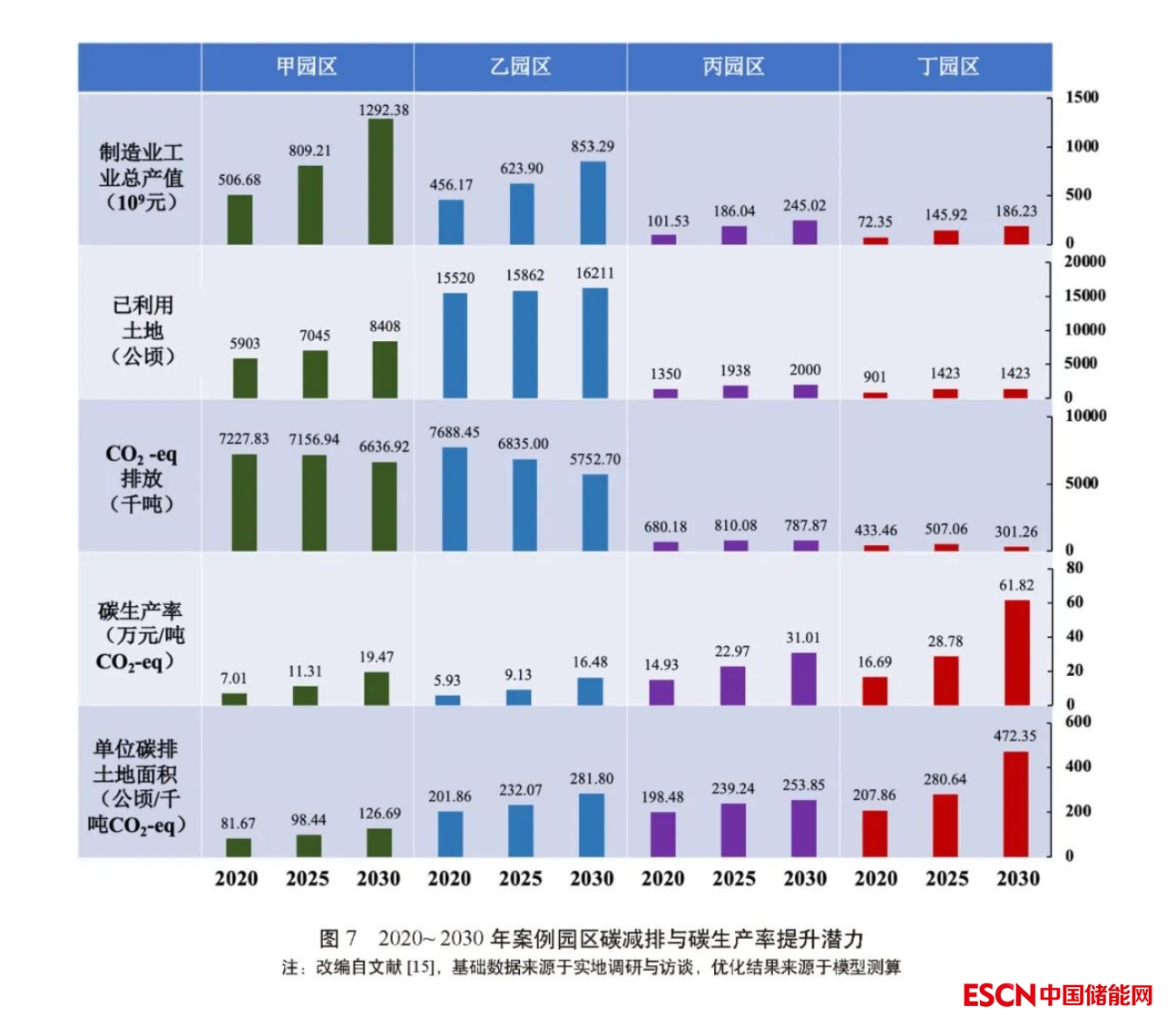 模型優(yōu)化后的各園區(qū)產(chǎn)業(yè)轉(zhuǎn)型低碳發(fā)展個性化路徑顯示,甲園區(qū)2030 年開發(fā)土地面積將達8408 公頃,仍低于園區(qū)總可利用面積,滿足園區(qū)進一步發(fā)展需求,園區(qū)總體碳生產(chǎn)率將較2020 年增長178%,至19.47 萬元/ 噸CO2-eq。對于乙園區(qū),15 個重點行業(yè)結(jié)構(gòu)升級后,其在2030 年碳生產(chǎn)率可達16.48 萬元/ 噸CO2-eq。對于丙園區(qū),經(jīng)17個行業(yè)深度轉(zhuǎn)型后其2030 年總體碳生產(chǎn)率相較基準(zhǔn)年將提升一倍至31.01 萬元/ 噸CO2-eq,但此時將達到園區(qū)可利用土地面積上限,需進一步擴充發(fā)展空間。丁園區(qū)將于2025 年前達到土地發(fā)展上限,若此后該園區(qū)無空間擴張而注重存量行業(yè)提升,其在2030 年碳生產(chǎn)率仍可達61.82 萬元/ 噸CO2-eq,減碳效果最為顯著。