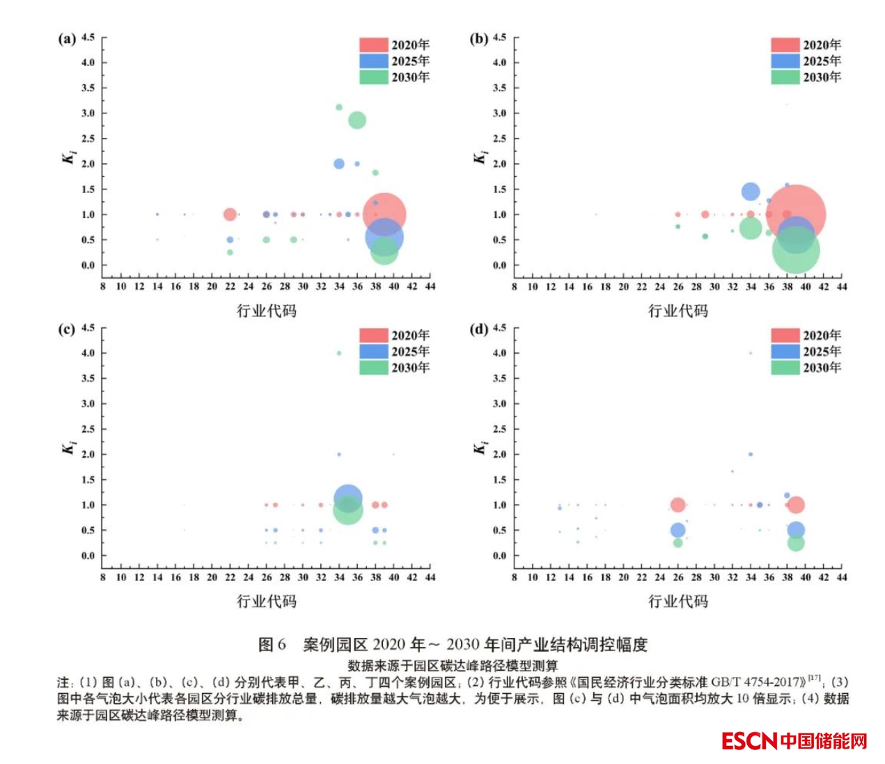 根據(jù)《國民經(jīng)濟行業(yè)分類》標(biāo)準(zhǔn),19個行業(yè)在四個園區(qū)中均有體現(xiàn),四個行業(yè)存在于三家園區(qū),五個行業(yè)存在于兩個園區(qū),還有三個特異性行業(yè)僅存在于單個園區(qū),體現(xiàn)出園區(qū)個性與共性兼具的復(fù)合特征。統(tǒng)籌兼顧“持續(xù)改進、整體提升、對標(biāo)先進”的優(yōu)化原則,應(yīng)用模型調(diào)控園區(qū)產(chǎn)業(yè)結(jié)構(gòu)并據(jù)此重新分配各行業(yè)間的碳排放配額, 圖6 揭示了各園區(qū)分行業(yè)2020年~2030 年間產(chǎn)業(yè)結(jié)構(gòu)調(diào)整策略(以Ki 表示)。計算各行業(yè)的Ki 平均值后發(fā)現(xiàn),19個常見行業(yè)Ki 值的方差為0.35,而其余行業(yè)Ki 的方差僅為0.03。與一般產(chǎn)業(yè)相比,特異性行業(yè)的產(chǎn)業(yè)結(jié)構(gòu)調(diào)整幅度更小,主要源于一般性產(chǎn)業(yè)具有更高的可替代性,因而在園區(qū)產(chǎn)業(yè)結(jié)構(gòu)升級時會有較大波動,需關(guān)注此類產(chǎn)業(yè)在園區(qū)深入推動綠色低碳發(fā)展進程中的平穩(wěn)轉(zhuǎn)型。
