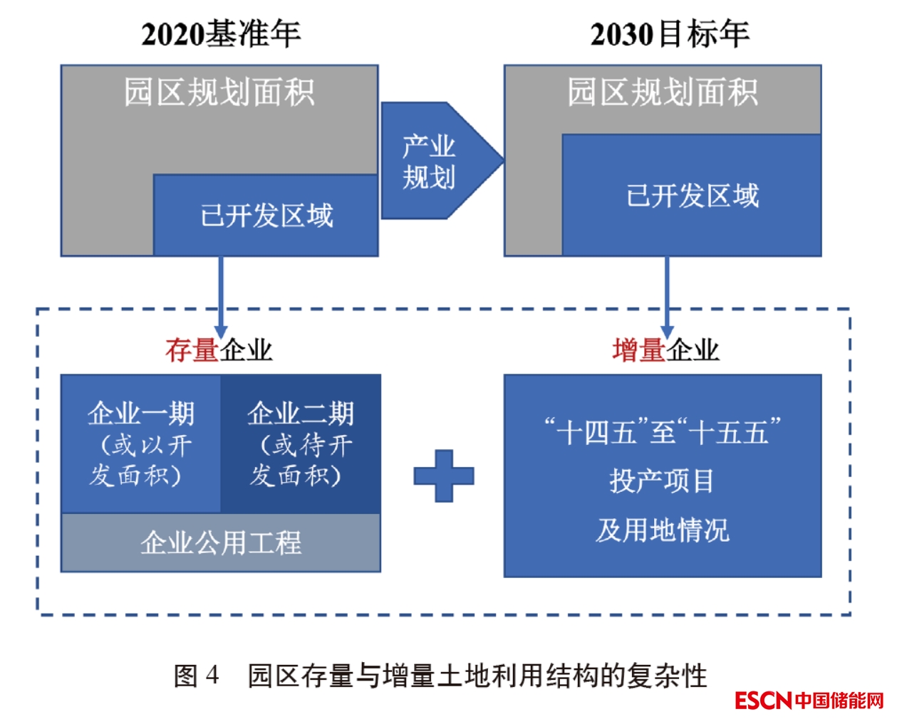 土地是工業(yè)園區(qū)承載經(jīng)濟生產(chǎn)活動的基礎(chǔ),也直接決定了園區(qū)未來的產(chǎn)業(yè)發(fā)展?jié)摿?。因而模型以土地為出發(fā)點,在確定園區(qū)四大邊界前提下通過土地利用矢量圖與土地集約利用情況評價報告等資料,精準(zhǔn)識別園區(qū)總規(guī)劃土地、未來潛在新增的可供應(yīng)土地、企業(yè)已建土地與已批待建土地面積等數(shù)據(jù)。園區(qū)在實踐管理中形成了多樣的園區(qū)空間,總規(guī)劃土地面積并不是可以全部用于基礎(chǔ)設(shè)施與產(chǎn)業(yè)項目的布局,而已開發(fā)土地又可細(xì)分為存量企業(yè)不同時期的開發(fā)項目、企業(yè)公用工程、未來增量企業(yè)的新型投產(chǎn)項目,因此需集成未來產(chǎn)業(yè)布局與土地開發(fā)政策目標(biāo),系統(tǒng)統(tǒng)籌園區(qū)未來土地利用與產(chǎn)業(yè)發(fā)展前景(見圖4)。