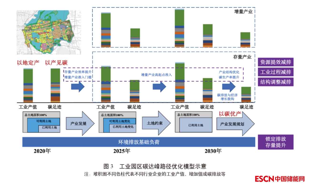 園區(qū)碳達峰模型設(shè)計應(yīng)基于存量產(chǎn)業(yè)特征、未來產(chǎn)業(yè)發(fā)展規(guī)劃、土地存量、可用余量、開發(fā)速度與碳排放歷史變化趨勢等,研究慣性產(chǎn)業(yè)發(fā)展結(jié)構(gòu)與模式下園區(qū)的能源消耗、資源使用、全生命周期碳足跡,揭示基準(zhǔn)情景下園區(qū)的碳排放峰值。根據(jù)在不同的工業(yè)規(guī)模與碳生產(chǎn)率提升情景下,園區(qū)內(nèi)各個產(chǎn)業(yè)對標(biāo)國內(nèi)外資源能源使用效率先進水平的潛在提升空間,面向園區(qū)經(jīng)濟發(fā)展預(yù)期、環(huán)境約束性指標(biāo)、資源能源消耗與碳排放“雙控”目標(biāo),設(shè)置合適的園區(qū)總體碳配額優(yōu)化配置算法,搭建多準(zhǔn)則約束下碳排放與經(jīng)濟增長脫鉤決策模型,設(shè)計碳配額在各產(chǎn)業(yè)部門間最合適的分配方案。