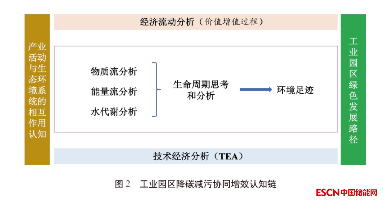 基于實踐,本文認(rèn)為園區(qū)制定碳達峰路徑時應(yīng)先清晰說明四大邊界,進一步建立邊界明晰的物質(zhì)- 能量流動分析方法,從而構(gòu)建基于多流- 多過程- 多節(jié)點融合模型的全生命周期碳足跡測算體系,建立園區(qū)降碳減污協(xié)同增效認(rèn)知鏈,解決園區(qū)經(jīng)濟、能源、環(huán)境綜合分析邊界不明確不統(tǒng)一問題(見圖2)。