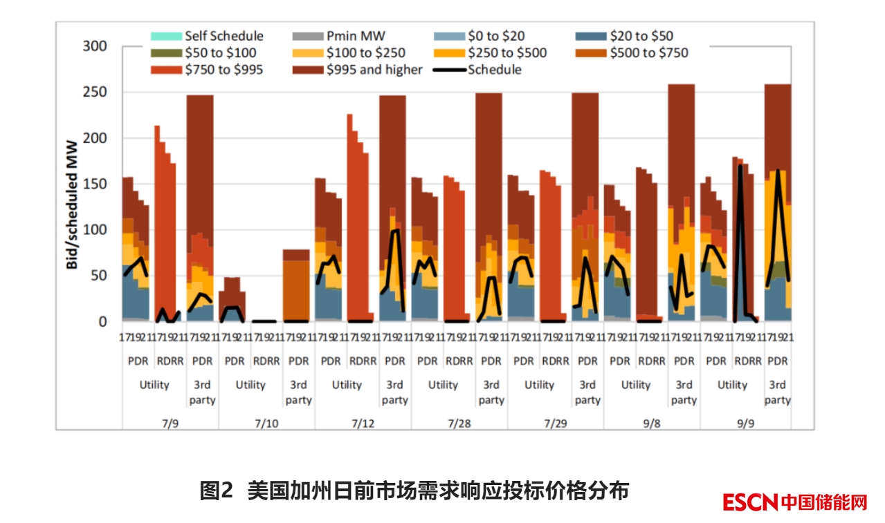 實際上,由于情景不同等原因,國外電力市場價格與需求響應補償標準呈現(xiàn)出相同的高度相關性。根據(jù)美國加州獨立操作系統(tǒng)(ISO)市場監(jiān)管部2022年發(fā)布的《2021年需求響應問題和績效報告》,2021年美國加州電力日前市場不同時間需求響應投標價格分布如圖2所示。圖中橫坐標表示時間,激勵型需求響應全年僅發(fā)生在7月9日等7天,每次有公用事業(yè)和第三方參與需求響應投標,其中公用事業(yè)參與又分為可靠性需求響應資源(RDRR)和代理資源響應(PDR)兩種類型??v坐標表示投標減少的電力負荷。圖中各色塊表示投資價格或激勵型補償水平??梢钥闯觯瑘D中主要色塊為暗紅色,這個色塊表示995美元/兆瓦時及以上價格,而目前加州電力市場價格上限為1000美元/兆瓦時。由于電力短缺情況下電力批發(fā)市場交易價格一般會達到上限,可以認為加州需求響應補償標準與電力市場價格基本相等。