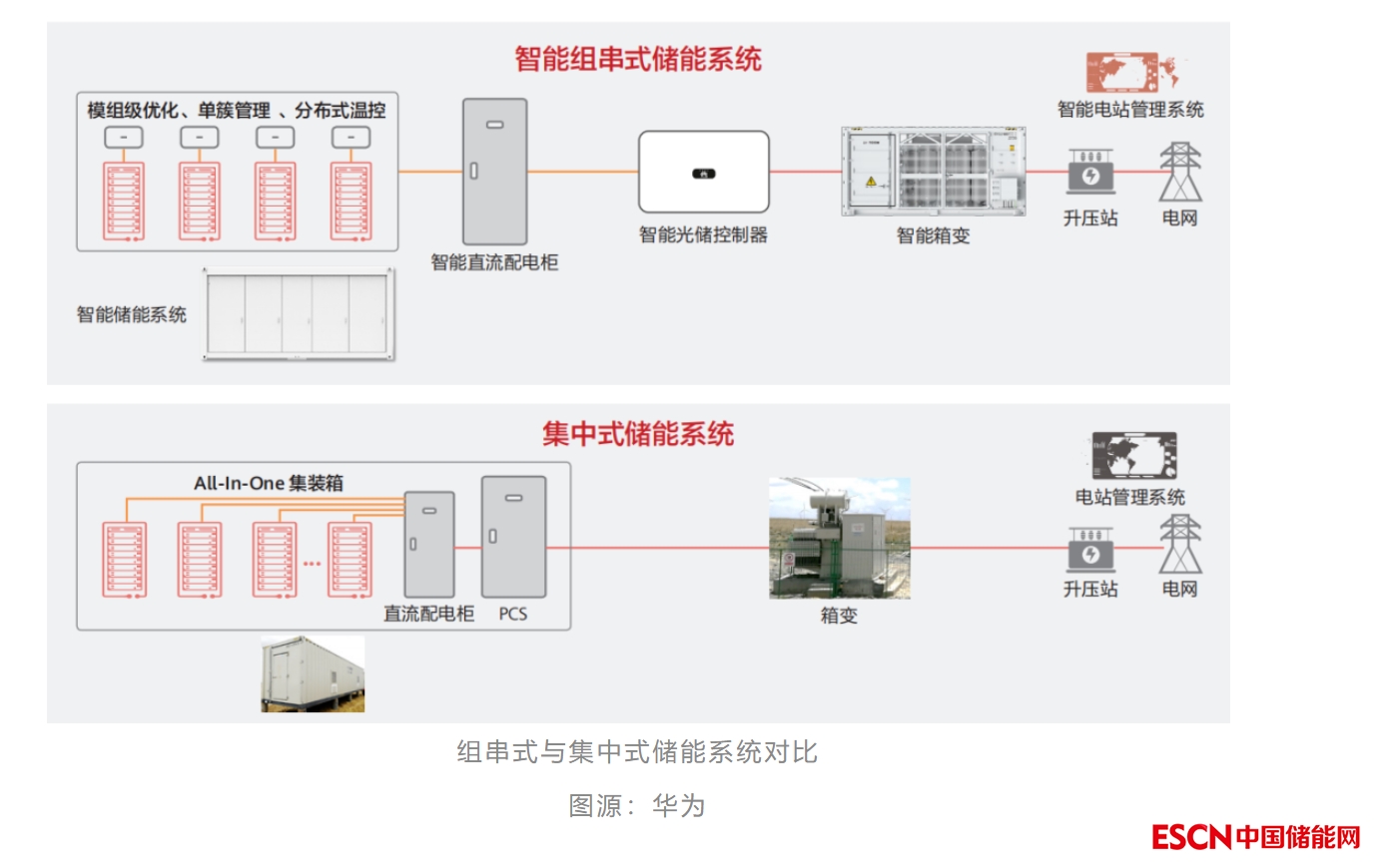 目前業(yè)內(nèi)電池儲能系統(tǒng)主要采取集中式PCS,多組電池并聯(lián)將引起電池簇之間的不均衡;組串式PCS可以實現(xiàn)簇級管理,提升系統(tǒng)壽命,提高全壽命周期放電容量,組串式PCS規(guī)?;瘧?yīng)用趨勢已見雛形。比如華能黃臺100MW/200MWh項目,是國內(nèi)首個采用組串式PCS架構(gòu)的大型儲能電站(PCS由上能電氣提供);山東德州林洋光儲3MW/6MWh項目也采用該系統(tǒng)架構(gòu)(華為提供整套系統(tǒng))。