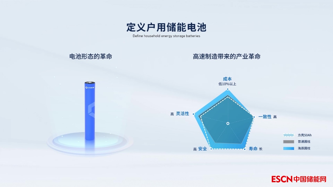 海辰大圓柱戶(hù)用儲(chǔ)能專(zhuān)用電池與傳統(tǒng)小方殼以及小圓柱電池相比,在成本、配組靈活性、安全性、壽命以及一致性上實(shí)現(xiàn)了大幅提升。例如在成本方面,大圓柱電池在生產(chǎn)方面依托高速產(chǎn)線(xiàn)輸出,成本優(yōu)勢(shì)明顯,其相較傳統(tǒng)生產(chǎn)低10%以上;又如在循環(huán)壽命方面較傳統(tǒng)圓柱電池大幅提升,突破5000次大關(guān);同時(shí),其靈活適配性更強(qiáng),可滿(mǎn)足戶(hù)用儲(chǔ)能應(yīng)用場(chǎng)景定制化需求。
