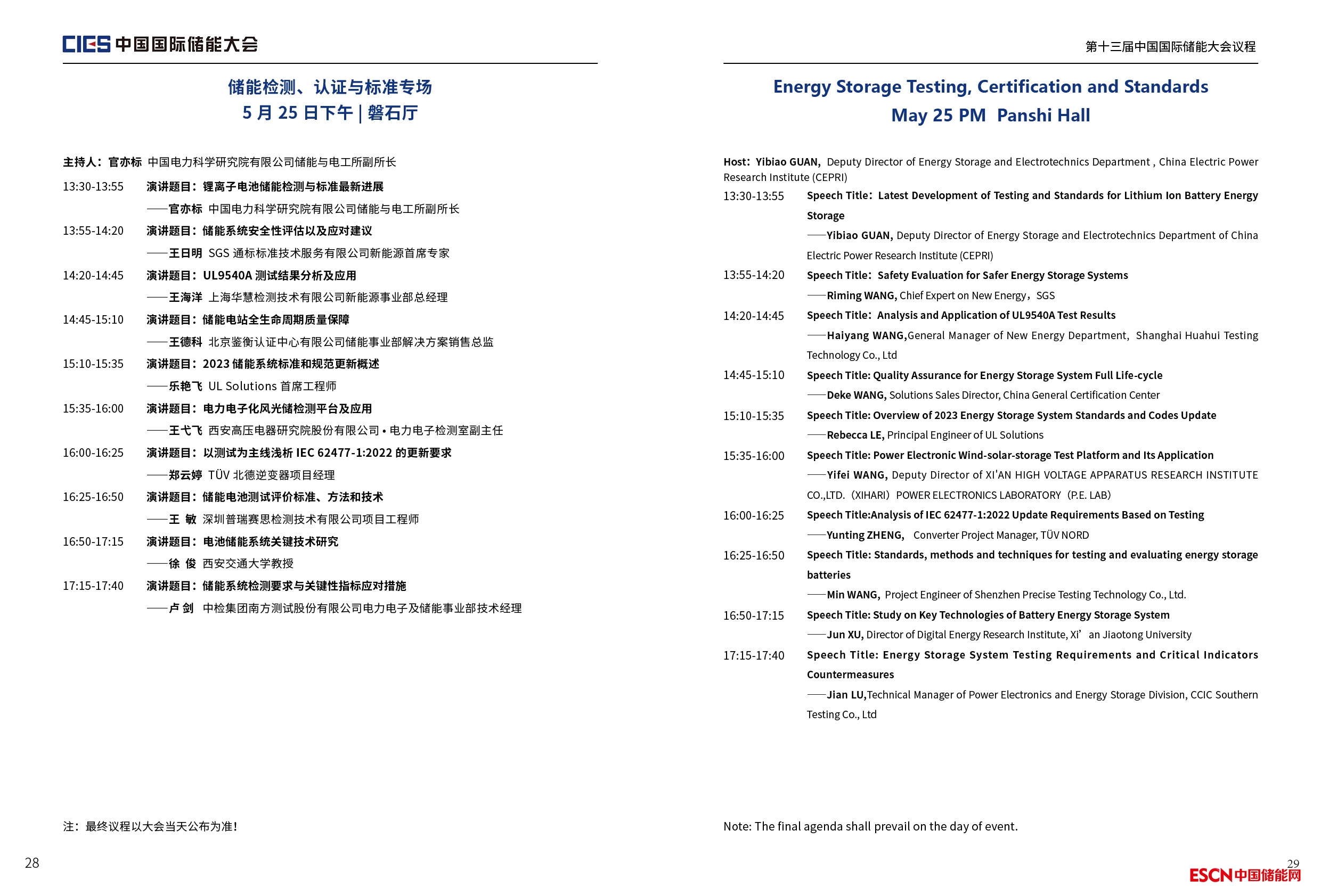 中國儲(chǔ)能網(wǎng)訊:由中國化學(xué)與物理電源行業(yè)協(xié)會(huì)主辦,中國化學(xué)與物理電源行業(yè)協(xié)會(huì)儲(chǔ)能應(yīng)用分會(huì)和中國儲(chǔ)能網(wǎng)聯(lián)合承辦,中國化學(xué)與物理電源行業(yè)協(xié)會(huì)儲(chǔ)能應(yīng)用分會(huì)專家委員會(huì)提供學(xué)術(shù)支持的第十三屆中國國際儲(chǔ)能大會(huì)將于2023年5月24-26日在杭州洲際酒店召開。以下為儲(chǔ)能檢測、認(rèn)證與標(biāo)準(zhǔn)專場議程(最終議程以活動(dòng)當(dāng)天公布為準(zhǔn)):
