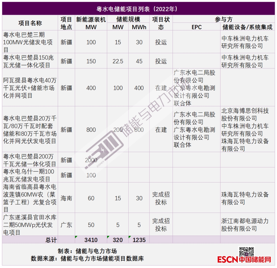 2022年,粵水電著重在西北地區(qū),如新疆、青海、 內蒙、陜西的基地項目中爭取開發(fā)地面光伏、陸地風電項目。伴隨這些項目的配儲需求,粵水電開發(fā)了多個大型儲能項目。尤其以新疆儲能項目最多?;浰姷膬δ茼椖慷歼M入了招標、建設、投運的實際階段,儲能總規(guī)模為320MW/1235MWh。