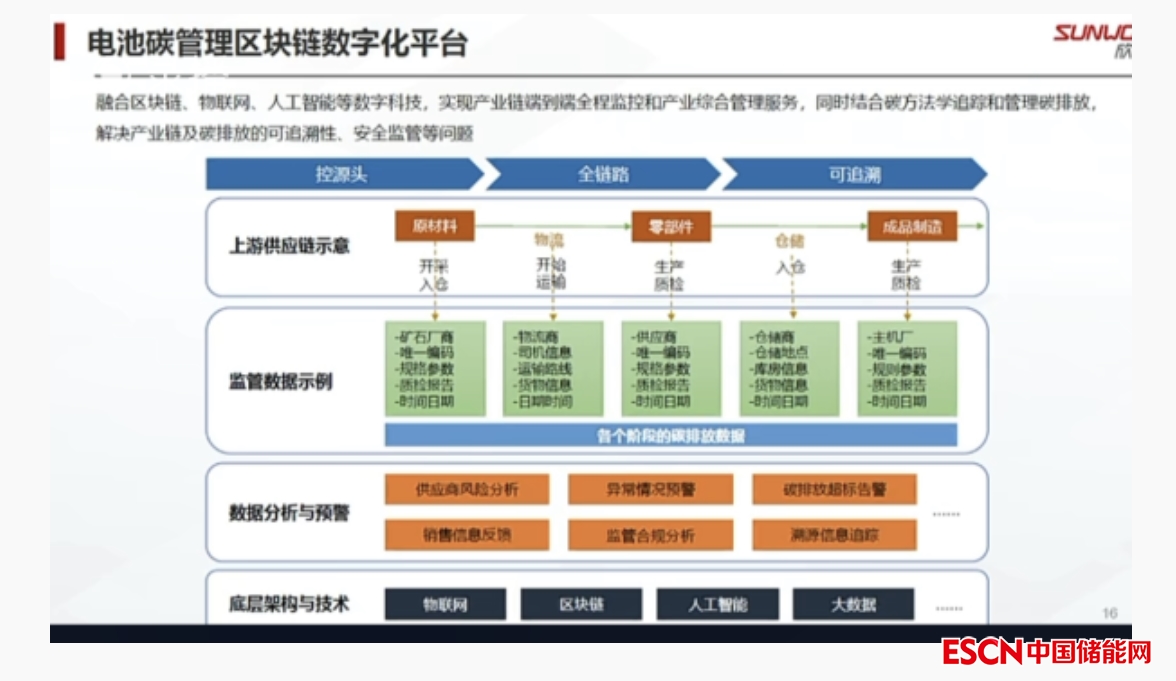 再次,在此基礎(chǔ)上,需要建立電池碳管理區(qū)塊鏈數(shù)字化平臺,要融合物聯(lián)網(wǎng)、人工智能等數(shù)字科技,實現(xiàn)產(chǎn)業(yè)鏈端到端全程監(jiān)控和產(chǎn)業(yè)綜合管理服務(wù),同時結(jié)合碳方法學(xué)追蹤和管理碳排放,解決產(chǎn)業(yè)鏈及碳排放的可追溯性的問題。