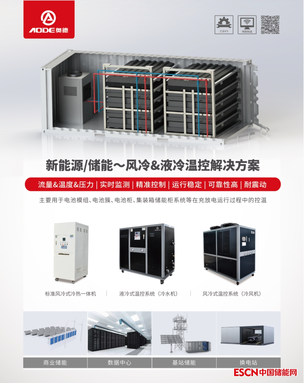 儲能電池工作中會持續(xù)性地釋放熱量,最佳工作溫度區(qū)間為10~35℃,當(dāng)溫度低于-20℃時,電解液可能會凝固,從而阻礙鋰離子的流動,而當(dāng)溫度超過 60℃時對電芯造成潛在破壞,嚴(yán)重時將引發(fā)著火爆炸安全事故。奧德依托近20年的工業(yè)溫度控制經(jīng)驗、強(qiáng)大的研發(fā)和技術(shù)團(tuán)隊,快速響應(yīng)組建針對儲能行業(yè)的溫度控制系統(tǒng)解決方案的團(tuán)隊,聚焦儲能安全,護(hù)航儲能產(chǎn)業(yè)穩(wěn)步發(fā)展,推出儲能行業(yè)風(fēng)冷系列和液冷系列溫控產(chǎn)品,溫控范圍:-40℃~+60℃,采用國際一線品牌壓縮機(jī),可實現(xiàn)智能化溫度調(diào)節(jié)和流量監(jiān)視,且產(chǎn)品結(jié)構(gòu)緊湊、運(yùn)行穩(wěn)定、耐震動、穩(wěn)定性高、安裝方便,主要應(yīng)用于電池模組,電池簇,電池柜,集裝箱儲能柜系統(tǒng)等在充放電運(yùn)行過程中的控溫,運(yùn)用場景主要為:實驗室,大型儲能站、商業(yè)儲能、數(shù)據(jù)中心、汽車換電站等。