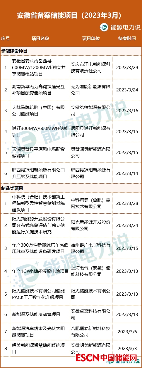 3月,安徽省備案儲(chǔ)能項(xiàng)目14個(gè)。其中儲(chǔ)能建設(shè)類項(xiàng)目6個(gè),包括獨(dú)立共享儲(chǔ)能、漁光互補(bǔ)、風(fēng)電場(chǎng)等配套儲(chǔ)能電站項(xiàng)目;儲(chǔ)能產(chǎn)品制造類項(xiàng)目8個(gè),涉及儲(chǔ)能系統(tǒng)、儲(chǔ)能關(guān)鍵技術(shù)研發(fā)、儲(chǔ)能設(shè)備、液流電池等儲(chǔ)能產(chǎn)業(yè)鏈產(chǎn)品制造。