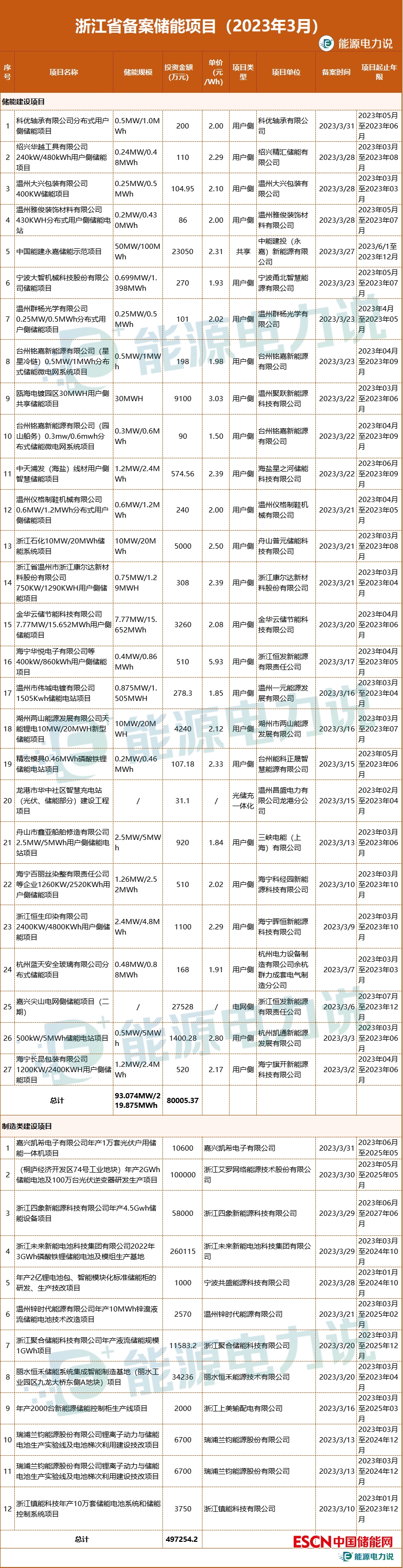 3月,浙江省備案儲(chǔ)能項(xiàng)目39個(gè),其中儲(chǔ)能建設(shè)項(xiàng)目27個(gè),總規(guī)模約93.074MW/219.875MWh,總投資金額約8億元,以工商業(yè)用戶側(cè)儲(chǔ)能項(xiàng)目為主;儲(chǔ)能產(chǎn)品制造類項(xiàng)目12個(gè),總投資金額約49.7億元,包括生產(chǎn)或研發(fā)儲(chǔ)能電池的原材料或制造設(shè)備、儲(chǔ)能系統(tǒng)、液流儲(chǔ)能、儲(chǔ)能設(shè)備等儲(chǔ)能產(chǎn)業(yè)鏈產(chǎn)品制造的生產(chǎn)及研發(fā)。
