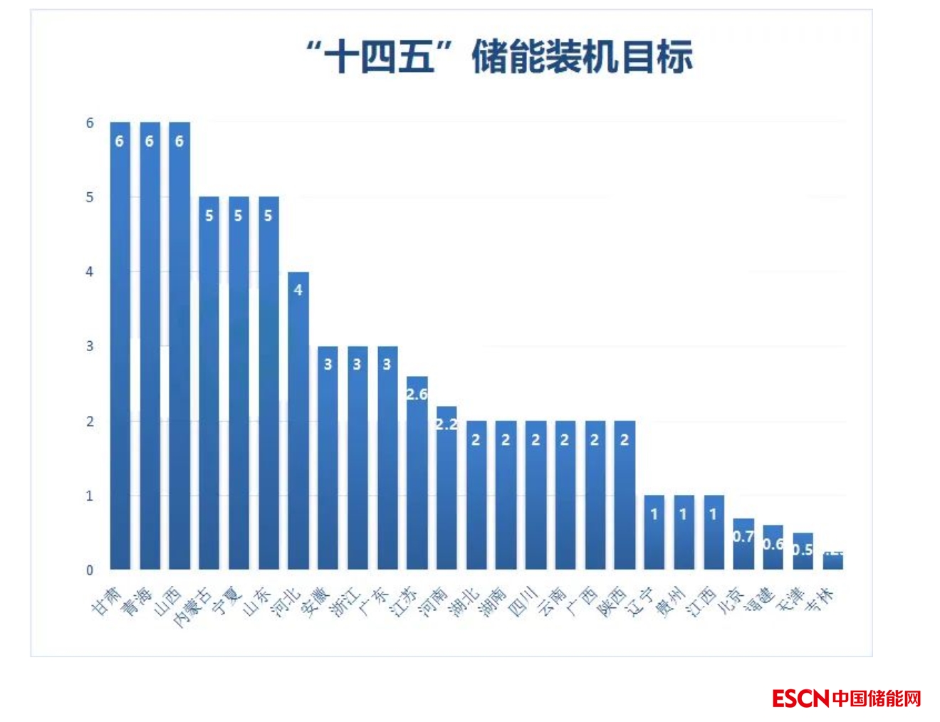 “十四五”是儲能由商業(yè)化初期向規(guī)?;l(fā)展轉(zhuǎn)變的關(guān)鍵階段。目前,已有25個?。ㄊ校┮?guī)劃了“十四五”期間的新型儲能裝機目標(biāo)及具體規(guī)劃,到2025年,預(yù)計新型儲能裝機目標(biāo)將達(dá)到67.85GW。青海、甘肅、山西的儲能規(guī)模最大,預(yù)計新型儲能裝機將達(dá)到6GW;山東、寧夏和內(nèi)蒙古緊隨其后,預(yù)計新型儲能裝機將達(dá)到5GW。