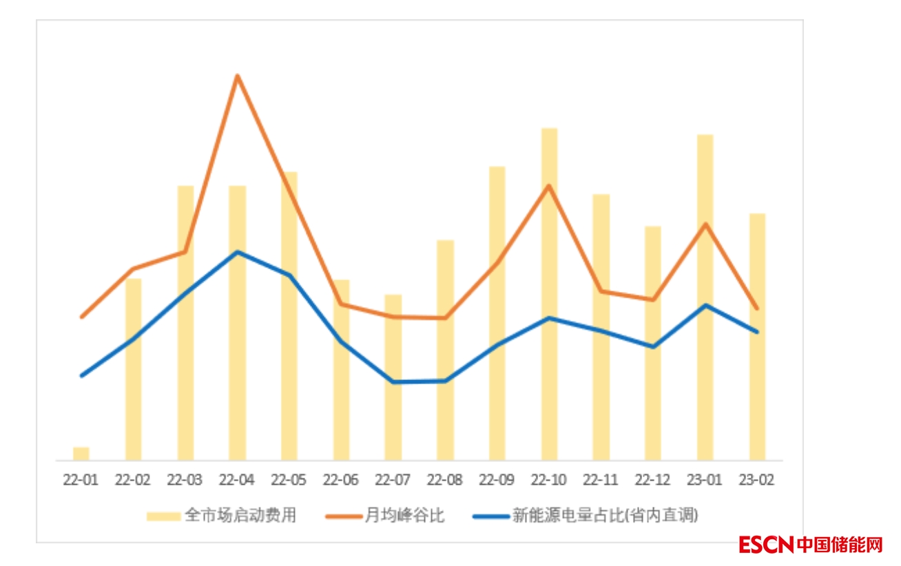 圖6 該省啟動(dòng)費(fèi)用與峰谷比、新能源發(fā)電量占比月度走勢(shì)