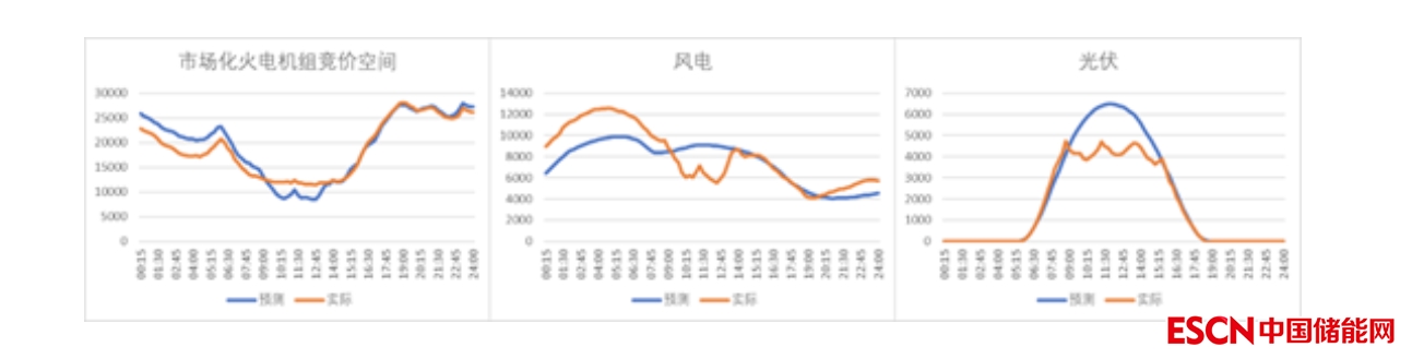 圖3 某日市場(chǎng)化火電機(jī)組出力空間及風(fēng)電、光伏出力預(yù)測(cè)與實(shí)際數(shù)據(jù)