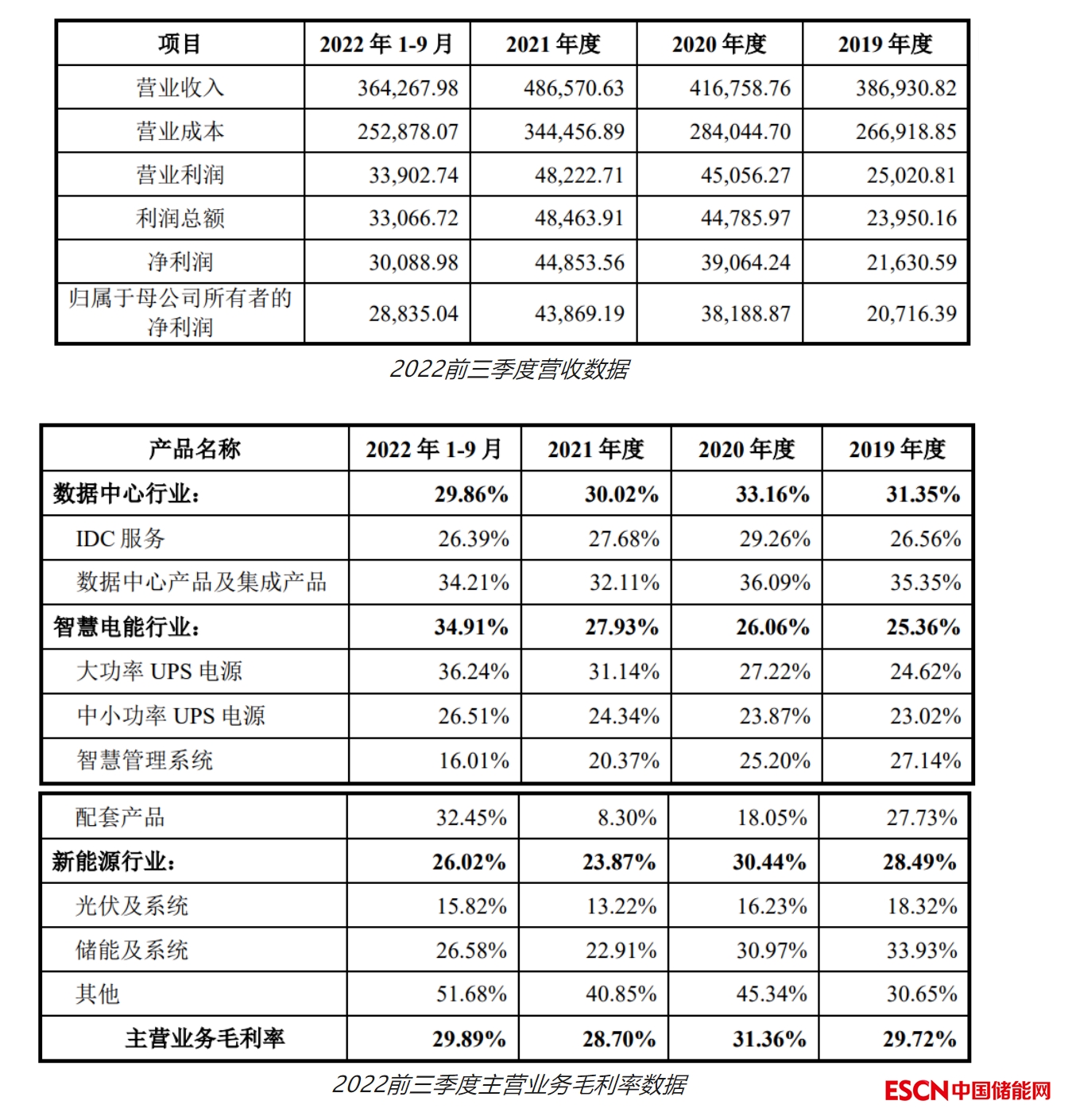 科華數(shù)據(jù)主營(yíng)數(shù)據(jù)中心、智慧電源與新能源三大業(yè)務(wù)。2022年前三季度,科華數(shù)據(jù)實(shí)現(xiàn)營(yíng)收約36.4億元,其中新能源產(chǎn)品收入約8.92億元,占同期主營(yíng)業(yè)務(wù)營(yíng)收比重為24.82%,毛利率為26.02%,而儲(chǔ)能及系統(tǒng)的毛利率達(dá)到了26.58%。