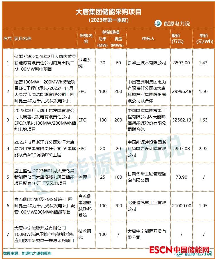 一季度,大唐集團(tuán)發(fā)布7個(gè)儲(chǔ)能相關(guān)采購項(xiàng)目,采購內(nèi)容包括儲(chǔ)能系統(tǒng)、儲(chǔ)能配套設(shè)備、儲(chǔ)能電站EPC等,采購項(xiàng)目儲(chǔ)能技術(shù)路線主要為磷酸鐵鋰。