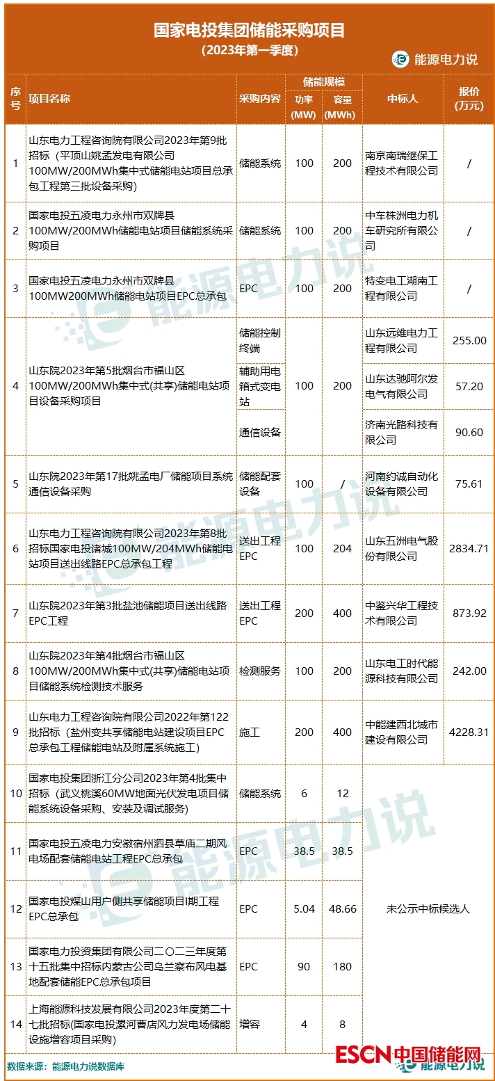 一季度,國家電投集團(tuán)共發(fā)布14個(gè)儲(chǔ)能相關(guān)采購項(xiàng)目,包括儲(chǔ)能系統(tǒng)、儲(chǔ)能系統(tǒng)配套設(shè)備、儲(chǔ)能項(xiàng)目EPC、送出工程EPC、檢測服務(wù)等。其中3個(gè)儲(chǔ)能系統(tǒng)采購項(xiàng)目規(guī)模約206MW/412MWh,4個(gè)儲(chǔ)能電站EPC項(xiàng)目的總?cè)萘考s為467MWh。