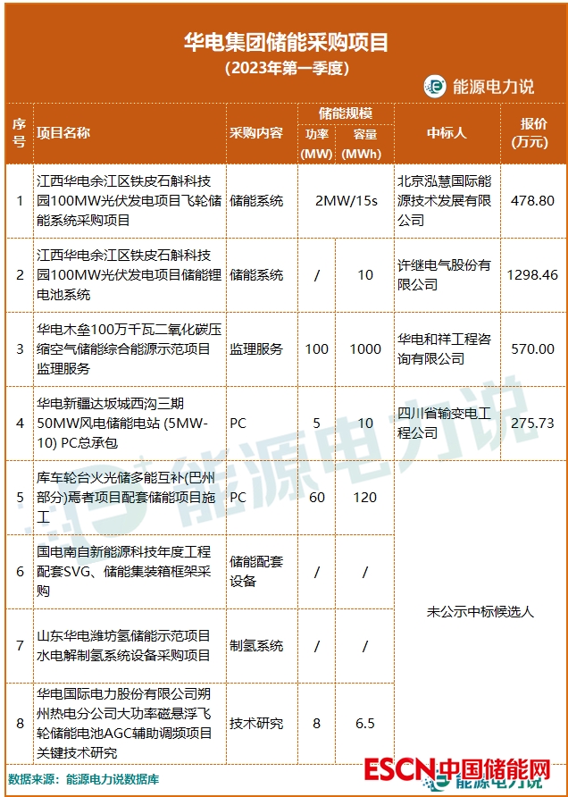 今年一季度,華電集團(tuán)共發(fā)布8個(gè)儲(chǔ)能項(xiàng)目采購項(xiàng)目,采購內(nèi)容包括鋰電池儲(chǔ)能系統(tǒng)、飛輪儲(chǔ)能系統(tǒng)、儲(chǔ)能配套設(shè)備、施工、監(jiān)理等;儲(chǔ)能技術(shù)路線涉及磷酸鐵鋰、飛輪儲(chǔ)能、二氧化碳儲(chǔ)能、氫儲(chǔ)能等。