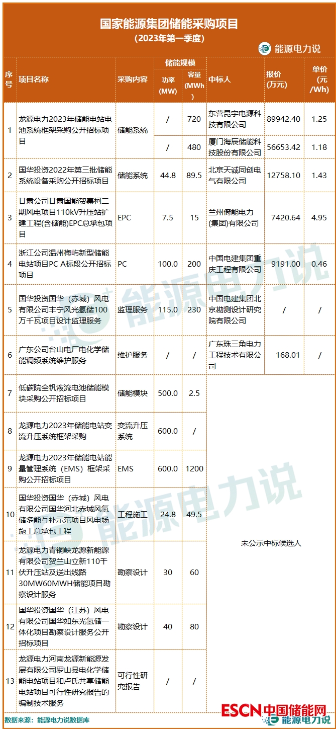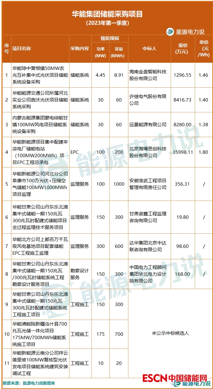 一季度,華能集團(tuán)共發(fā)布11個(gè)儲(chǔ)能相關(guān)采購項(xiàng)目,采購內(nèi)容包括儲(chǔ)能系統(tǒng)、集中式儲(chǔ)能項(xiàng)目EPC、監(jiān)理服務(wù)、勘察設(shè)計(jì)等。