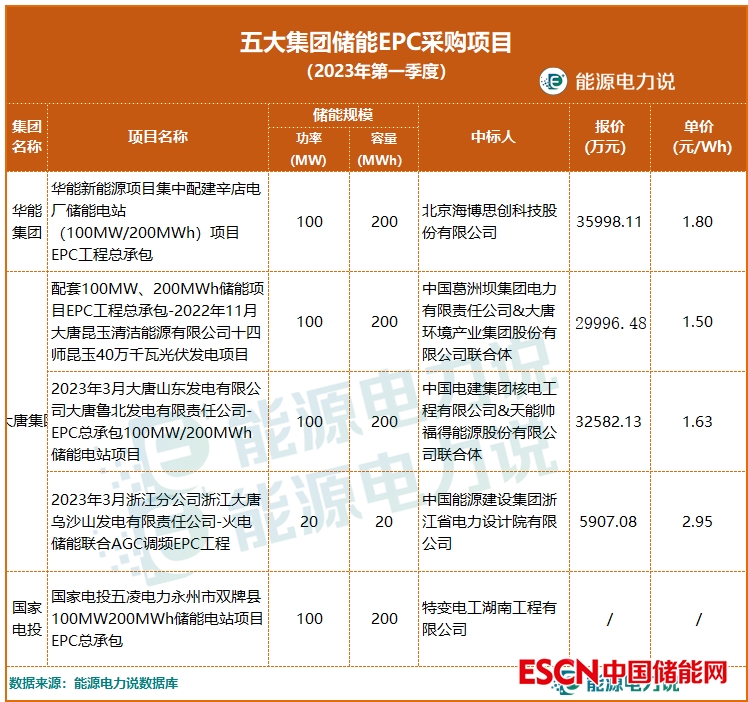 儲(chǔ)能EPC采購項(xiàng)目方面,華電、大唐、電投共完成4個(gè)儲(chǔ)能EPC項(xiàng)目采購,合計(jì)儲(chǔ)能規(guī)模約420MW/820MWh,單價(jià)在1.5-1.8元/Wh之間;其中華能集團(tuán)項(xiàng)目為鹽光伏項(xiàng)目、東明馬頭鎮(zhèn)光伏項(xiàng)目、煙臺(tái)臧家莊光伏項(xiàng)目等多個(gè)光伏項(xiàng)目集中配建100MW/200MWh儲(chǔ)能電站EPC項(xiàng)目,由北京海博思創(chuàng)科技股份有限公司中標(biāo),中標(biāo)單價(jià)約1.8元/Wh;大唐魯北發(fā)電有限責(zé)任公司電廠內(nèi)新建100MW/200MWh儲(chǔ)能電站EPC項(xiàng)目,由中國電建集團(tuán)核電工程有限公司&天能帥福得能源股份有限公司聯(lián)合體中標(biāo),中標(biāo)單價(jià)約1.63元/Wh;此外還有大唐烏沙山發(fā)電廠火電聯(lián)合調(diào)頻項(xiàng)目。