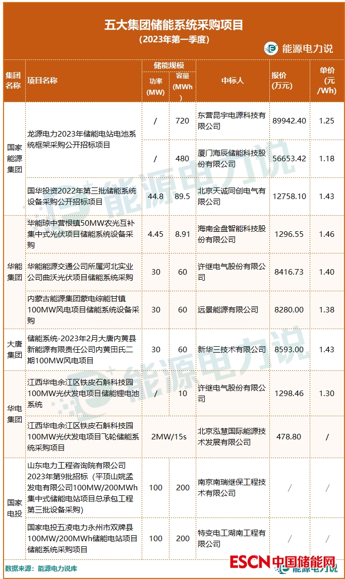 中國儲(chǔ)能網(wǎng)訊:今年一季度,五大發(fā)電集團(tuán)陸續(xù)發(fā)布儲(chǔ)能相關(guān)采購項(xiàng)目,采購內(nèi)容包括儲(chǔ)能系統(tǒng)、儲(chǔ)能配套設(shè)備、EPC、勘察設(shè)計(jì)、監(jiān)理服務(wù)等;技術(shù)路線方面,磷酸鐵鋰成主流技術(shù)路線,此外涉及全釩液流、飛輪、二氧化碳儲(chǔ)能、氫儲(chǔ)能等技術(shù);儲(chǔ)能應(yīng)用場景方面,“源網(wǎng)荷”均有涉及。