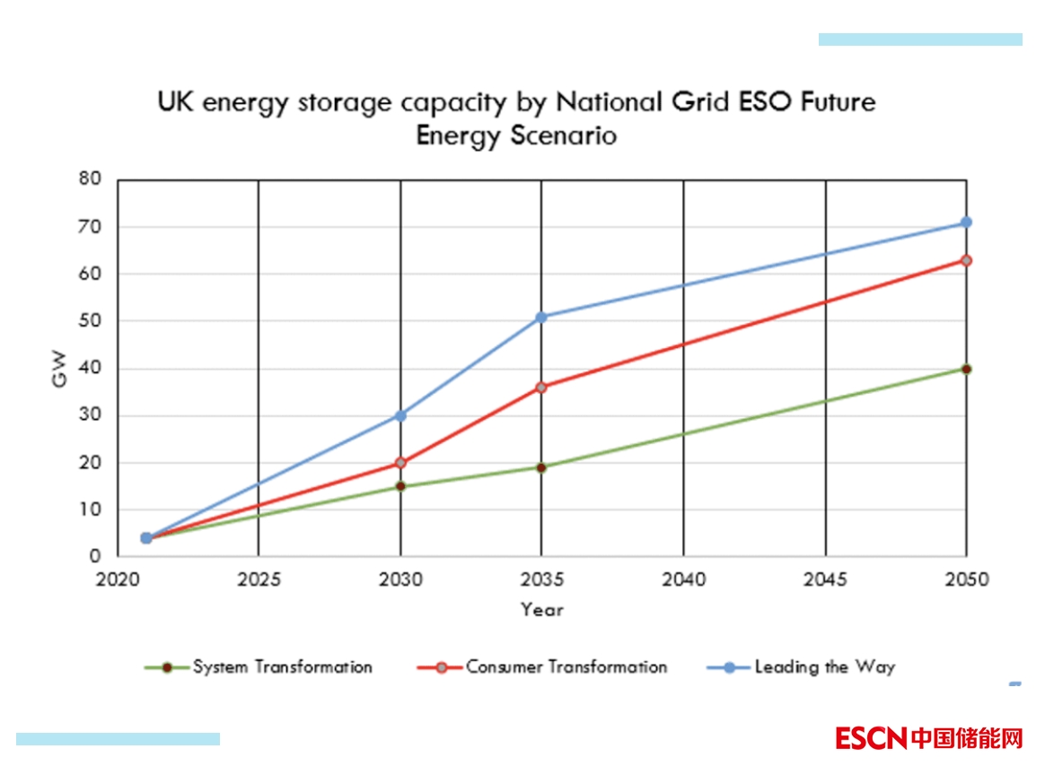 因此,英國需要在未來二十年內迅速擴大和部署儲能裝機,以替代天然氣目前的作用,才能實現(xiàn)零排放。英國目前的儲能容量僅為2.4吉瓦左右,但電力系統(tǒng)運營商國家電網ESO根據其未來能源需求情景估計,到2030年儲能裝機至少需要達到15吉瓦,到2050年至少需要40吉瓦,才能實現(xiàn)2050年的凈零排放目標。
