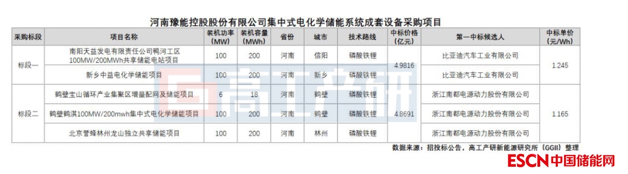 其中,河南省項(xiàng)目主要是河南豫能控股股份有限公司發(fā)布集中式電化學(xué)儲(chǔ)能系統(tǒng)成套設(shè)備采購(gòu)中標(biāo)項(xiàng)目。該中標(biāo)項(xiàng)目涉及包含5個(gè)集中式電化學(xué)儲(chǔ)能系統(tǒng)成套設(shè)備采購(gòu),儲(chǔ)能總規(guī)模406MW/818MWh,項(xiàng)目地點(diǎn)位于鶴壁、新鄉(xiāng)、南陽(yáng)、林州四市。該項(xiàng)目一標(biāo)段第一中標(biāo)候選人為比亞迪汽車(chē)工業(yè)有限公司,中標(biāo)報(bào)價(jià)49816萬(wàn)元,中標(biāo)單價(jià)單價(jià)1.245元/Wh;二標(biāo)段第一中標(biāo)候選人為浙江南都電源動(dòng)力股份有限公司,中標(biāo)報(bào)價(jià)48691萬(wàn)元,折合單價(jià)1.165元/Wh。