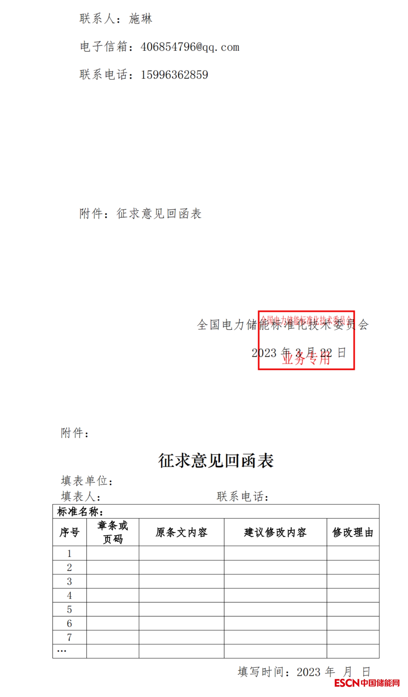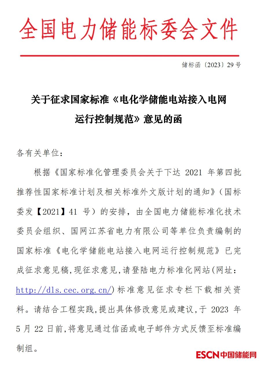 關于征求國家標準《 電化學儲能電站接入電網運行控制規(guī)范》意見的函