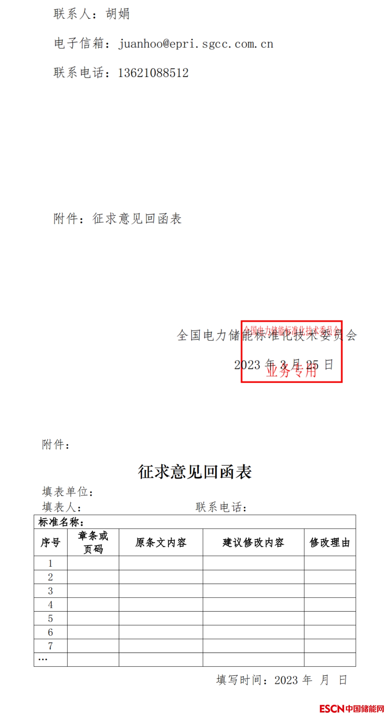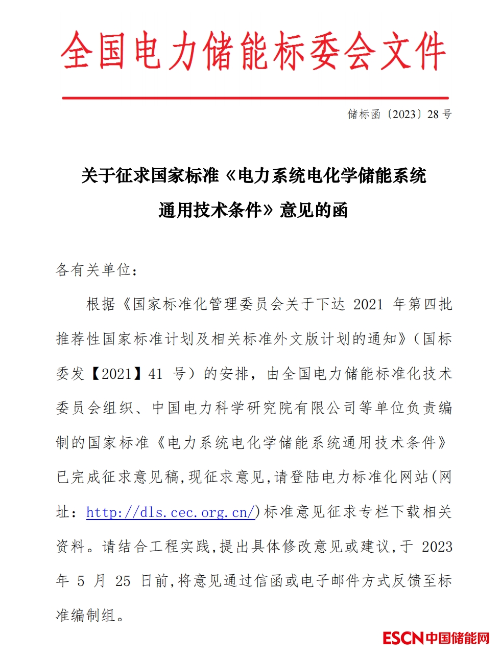 關(guān)于征求國家標(biāo)準(zhǔn)《電力系統(tǒng)電化學(xué)儲能系統(tǒng)通用技術(shù)條件》意見的函