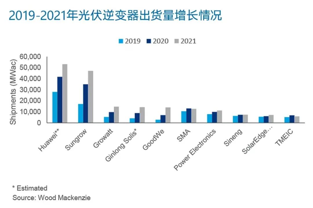 來自WoodMac的統(tǒng)計(jì)顯示,在全球前十的逆變器廠商中,國內(nèi)品牌占據(jù)六席,分別為華為、陽光電源、古瑞瓦特、錦浪、固德威、上能電氣。前十大逆變器廠商市場份額達(dá)82%。